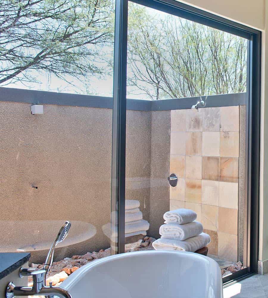 Sitting outside, sundowner in hand, and looking up to interact with Oscar, the resident giraffe. He'll stop by your balcony too, if you're lucky! Keep your camera ready...