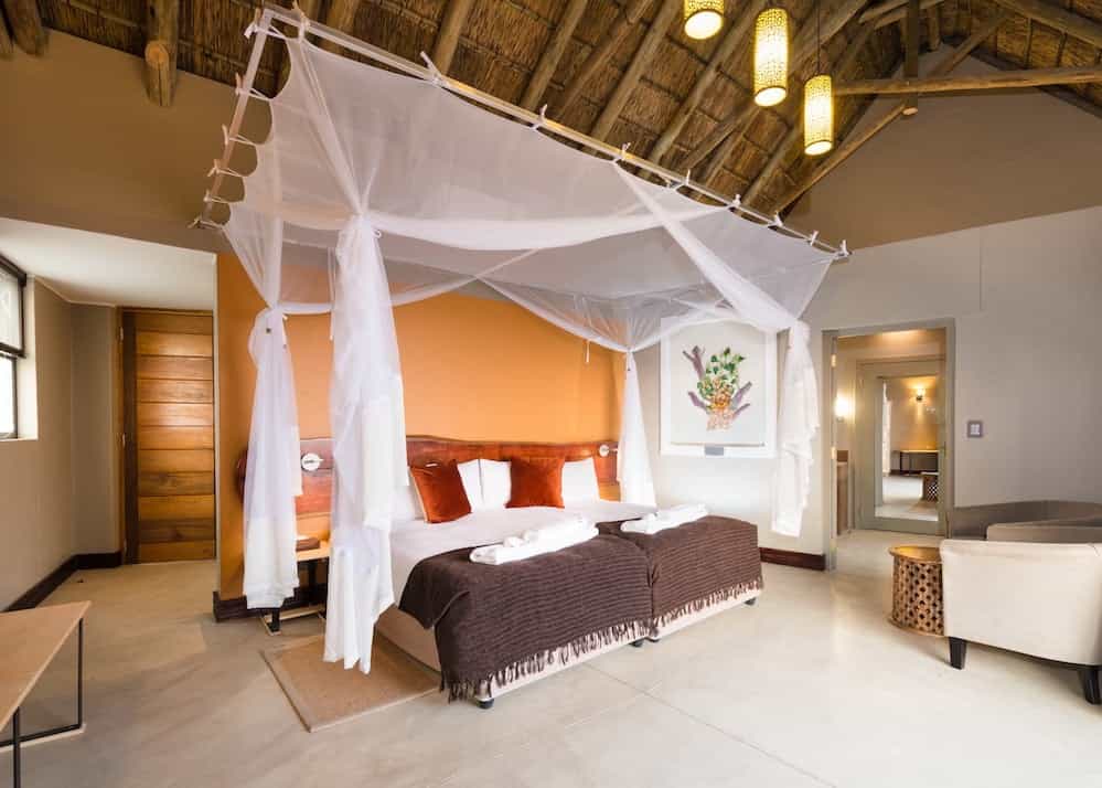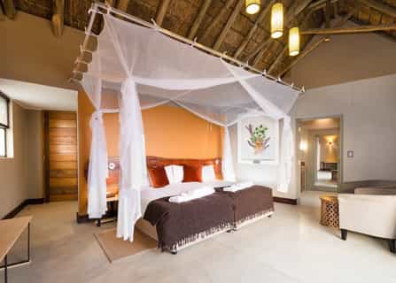 Safari Hoek has two standard chalets and eight slightly larger luxury chalets, plus a family unit with two bedrooms and a comfortable lounge. You'll enjoy the blend of classic safari elements (vaulted thatched ceilings, cool flagstone floors and romantic drapes of mosquito net ) and modern, uncluttered style with ethnically inspired splashes of colour. All chalets have en-suite bathrooms (the luxury chalets have both indoor and outdoor showers). Private wooden verandas offer great views.