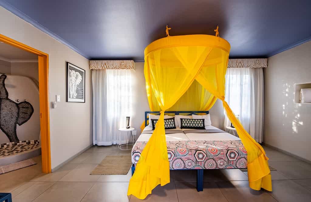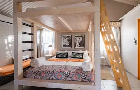 The unforgettable main area is colourful and eclectic - a place where you'll find everything from old bicycles and roadsigns to chairs made from tyres and bathtubs. A rusty railroad car serves as the camp's buffet. The central courtyard is home to green grass and plenty of outdoor seating and a sparkling swimming pool bedecked with umbrellas and poolside loungers. At night the patio comes alive with gas lanterns and campfire entertainment from the camp's talented and comic three-man band, The Etosha Boys. This is a sociable place where a variable standard of German-inspired home-cooked meals are served each night. Even if you're camping you are invited to enjoy all the main area's facilities and festivities.