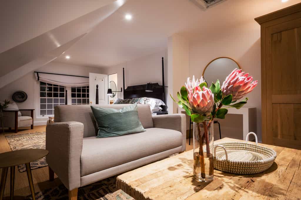 Fairview House stays true to its roots with an intimate and homegrown feel. Inspired by the works of South African painter, Irma Stern, the interiors are neutral with pops of striking colour - from the dining room's orange feature wall with a monkey motif to oil paintings on loan from the Everard Read Gallery. Tuck into well-planned cuisine made with locally-sourced ingredients; on the terrace in summer and warmed by the wood-burning stove in winter. There are a number of elegant lounges, one even enjoys a bar and grand piano. On hot days, the pool provides a secluded spot amongst the greenery.