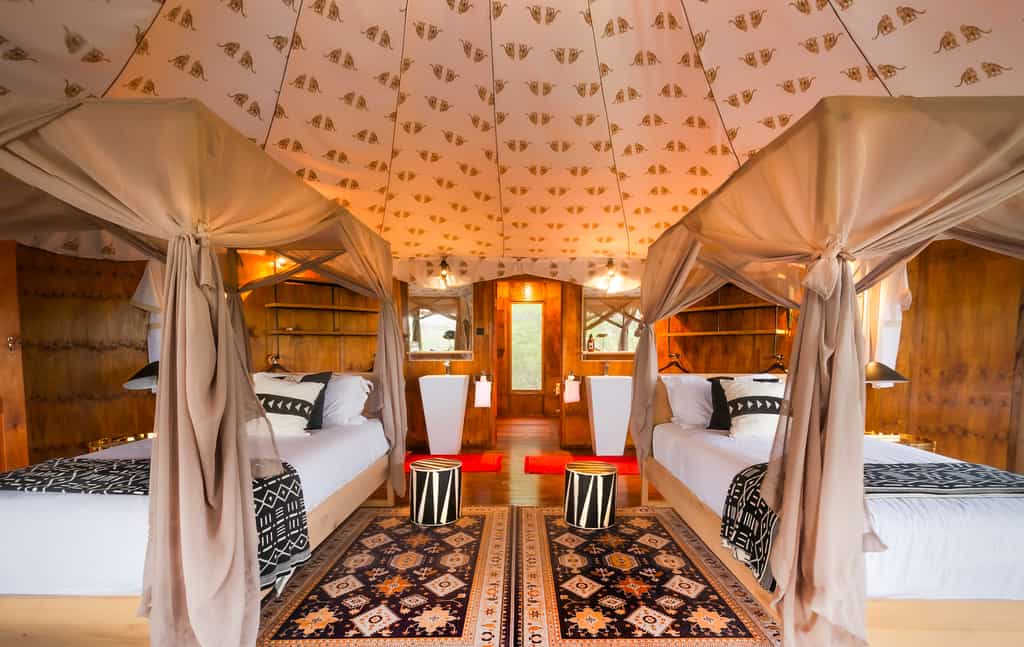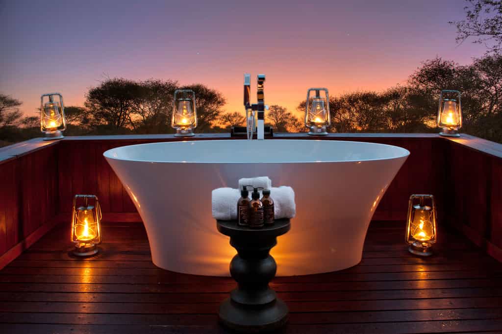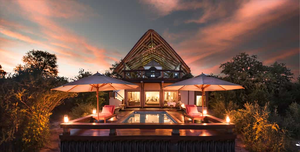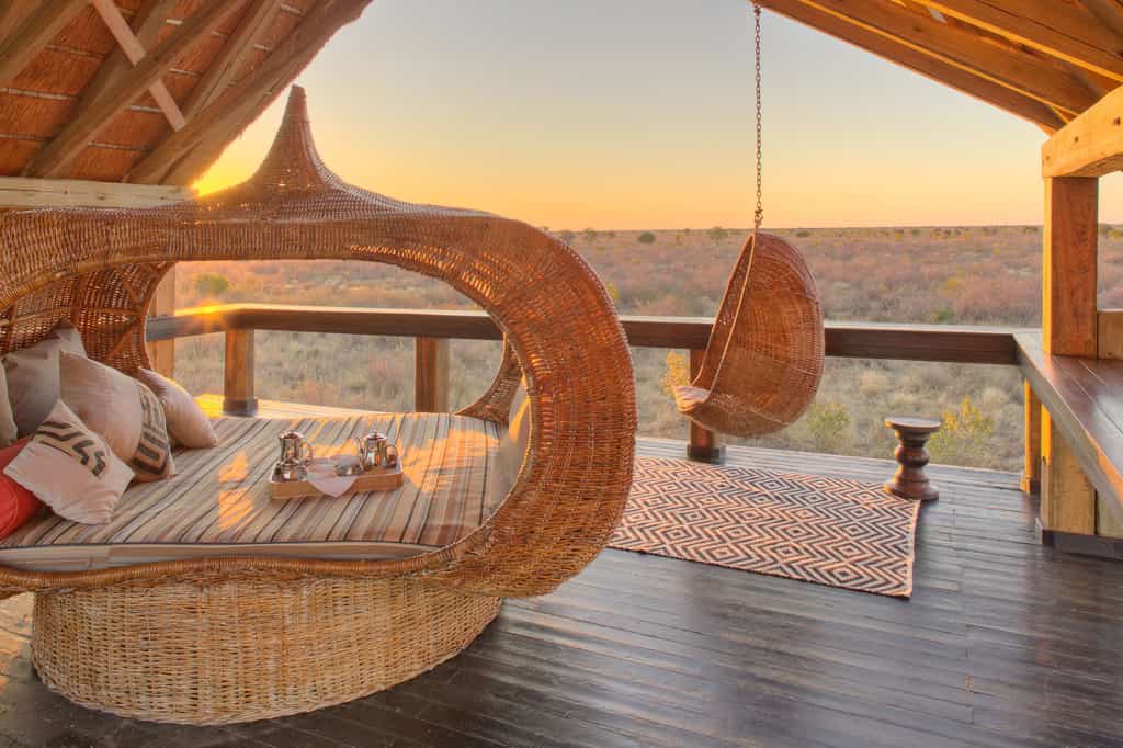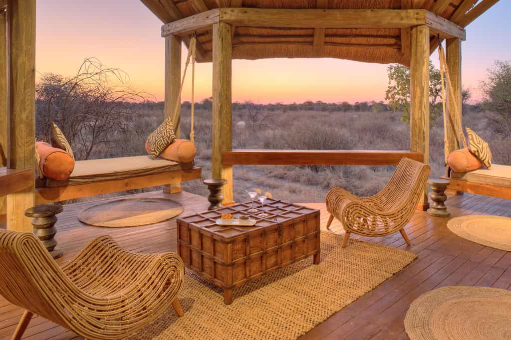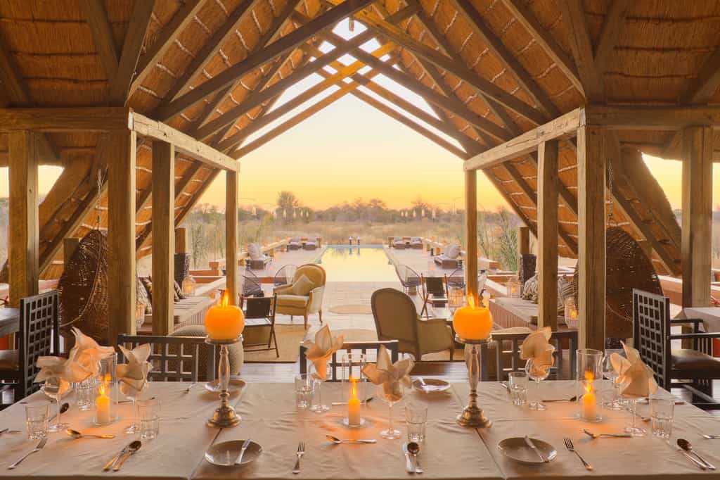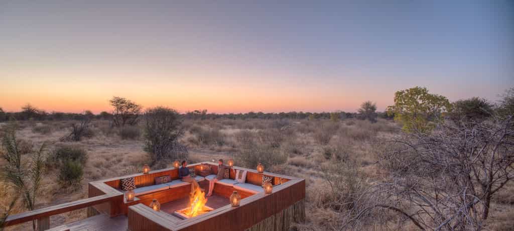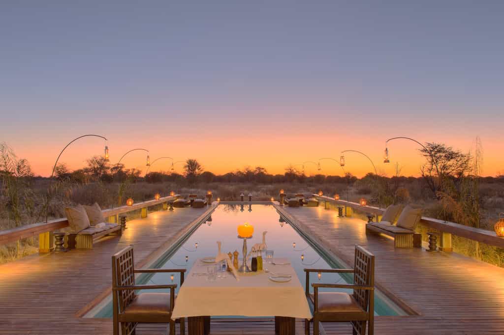 Elegant and minimalistic, stylish without trying too hard, this spanking-new lodge is designed to make an impression but not to stand out. Approaching by a vehicle the main lodge is camouflaged against the woodland with its thatched roof and wood and clay structures. Looking out onto the Kalahari plains, the main deck enjoys 180 degree views; it also incorporates a truly refreshing (and large) lap pool. There's a decent gym-with-a-view if you fancy staying active while keeping an eye out for game. Healthy, creative cuisine is served in the undercover dining area by day, or out on the lamp-lit verandah by night. You'll find a library well-curated with books on the region and a bar stocked with international wines and a thorough array of libations and refreshments of any sort.