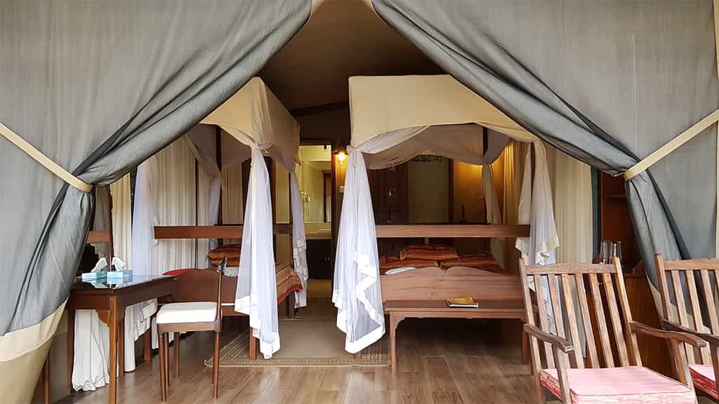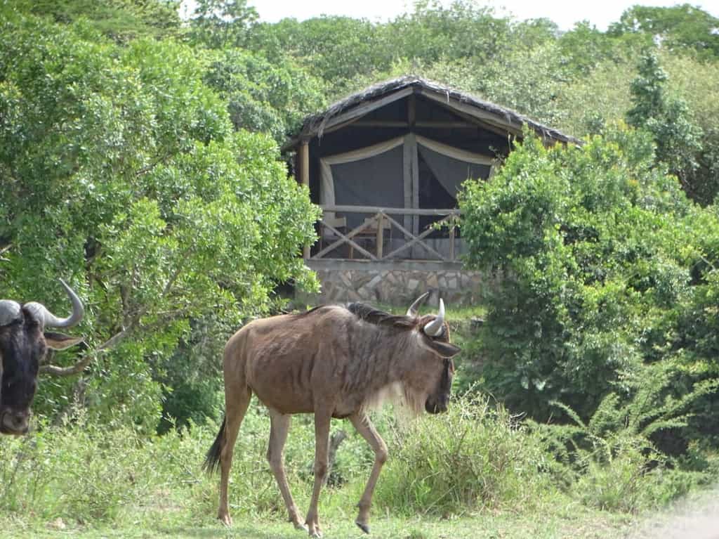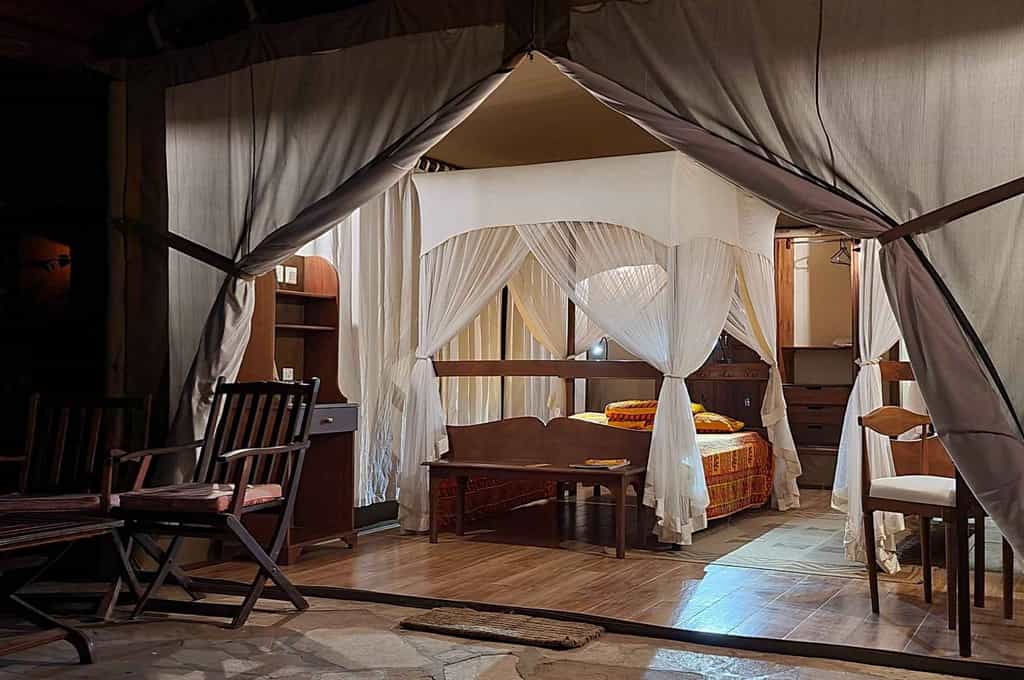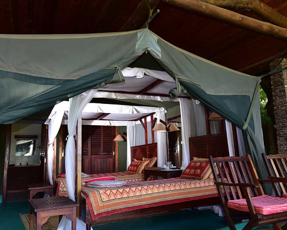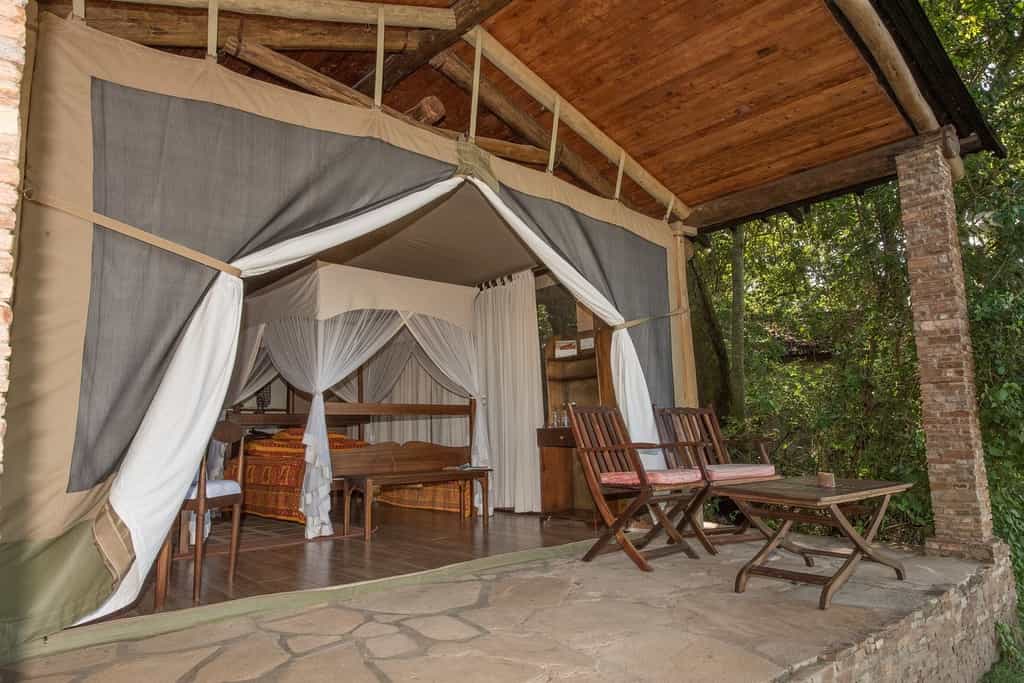 Winding along the riverbank are a total of 48 tents (accessed with a guide). The bulk of the accommodation is in Meru-style tents, each with a furnished front porch and large interior space. All have the glamorous air of those old-style safaris, with quality furnishings and en-suite bathrooms. There are 32 garden lodge rooms with solid walls as well. Electricity is generator-powered and available most of the day and night (although hot water can be intermittent).