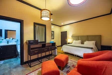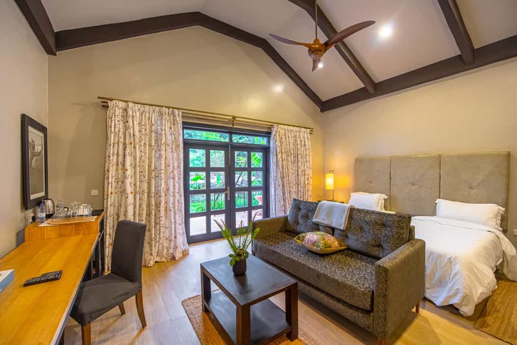 A double-storey thatched structure sits at the heart of the hotel – it's where meals (limited options, all good) are served and guests convene pre- and post explorations. From the open-sided platform you'll have sublime views of the volcano peaks, whether you're dining at the peripheral tables or lounging on the interior seating. A network of grass and flowerbeds lie between the buildings, and there's a slightly elevated pool surrounded by loungers. Wi-fi in the main areas is reasonably reliable.