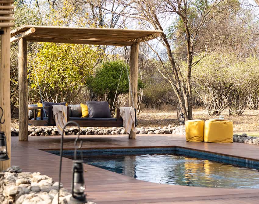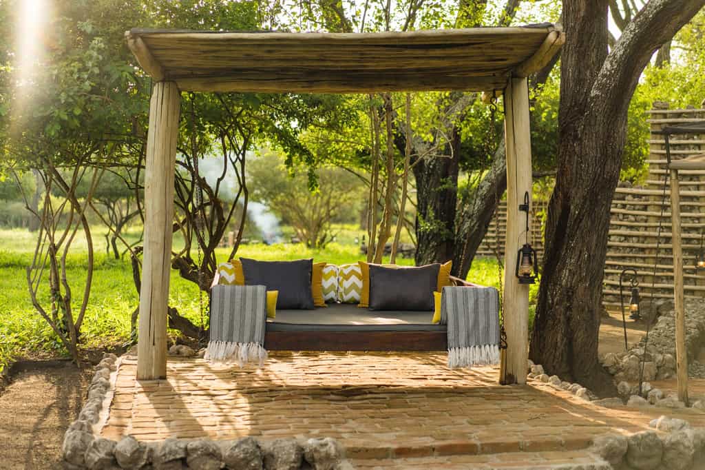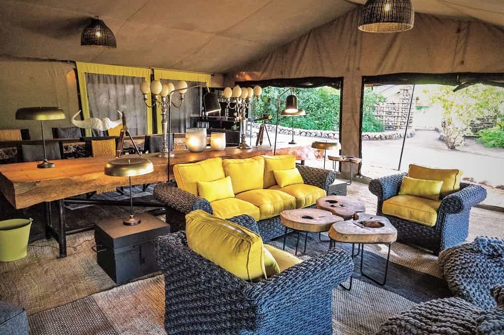 Taking its hues from the surrounding fever trees, the camp makes extensive, but subtle, use of soft greens and yellows, tan and grays. The main tent has cushioned wicker chairs to one side, and a long natural-wood dining table with ostrich-egg candelabras. The canvas sides roll up to make for easy flow to the patio, where there's another picnic table beside a large open-air fire pit. Outside, several generously cushioned hanging beds beg you to take a breezy siesta.