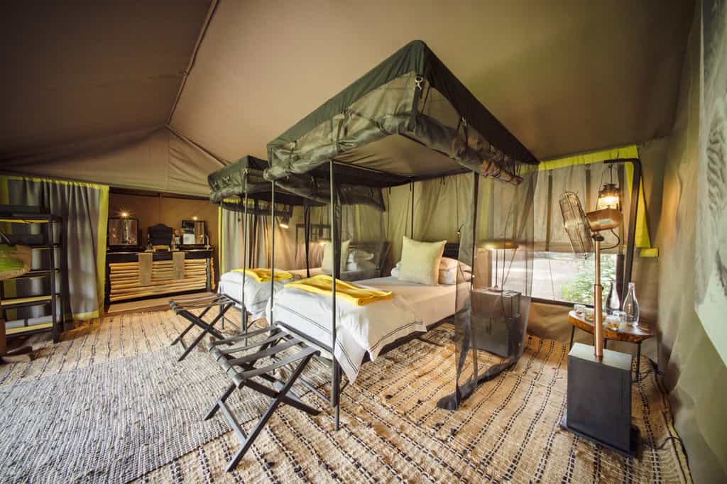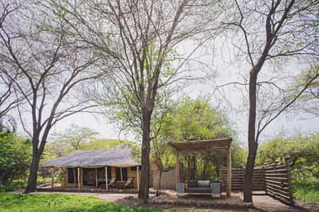There are three tents among the fever trees – two vintage doubles and a two-bedroom family tent, sleeping eight in total. All the tents can be made up as kings or twins. They're superbly comfortable and stylish, with no sign of the glitz evident at other five-star safari camps. Expect large carpets, desks and chairs, and wooden decks with more seating. En-suite bathrooms have indoor and outdoor showers, a dressing table and nice touches of wood and copper.