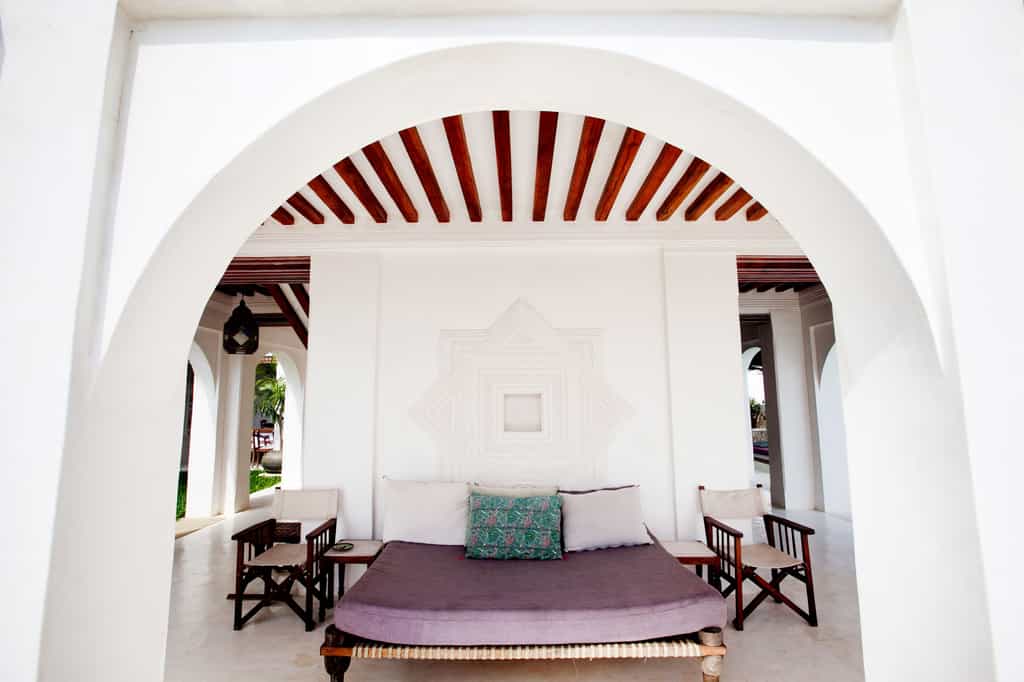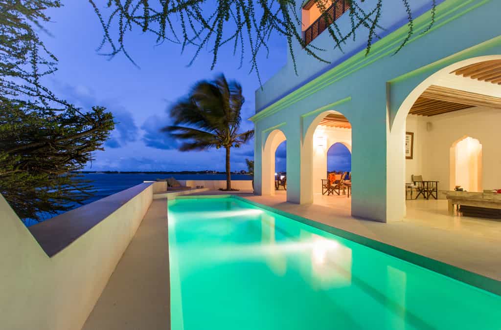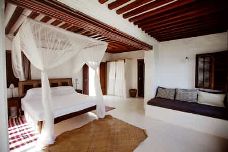 Built with sweeping 270° sea-views and in the traditional Swahili style, the house is all carved teak doors, hand-painted friezes and white washed walls. Decorated with traditional woven carpets and dark wood tables and chairs, the main lounge is a simple and elegant space, and Arabian arches frame stunning views of the ocean and sun-bleached terrace outside. There's also a private pool stretching out alongside the garden, bursting with palm trees, ylang ylang, frangipani and colourful bougainvillea.