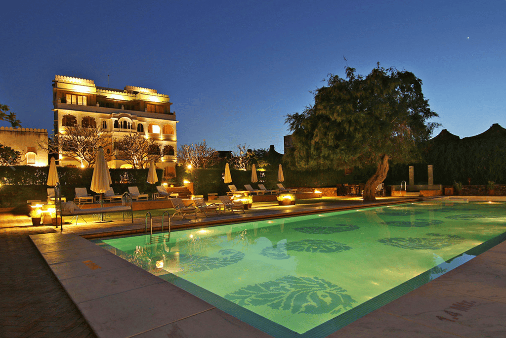 Fort Rawla's garden has a resort feel to it with a large patterned pool surrounded by loungers and leafy banana palms. Alongside, you'll find the Narlai Spa cabanas for a little R&R. There's all-day dining at the Jharoka Cafe with a varied menu and an open-air courtyard to enjoy the sunshine; or take your dinner with a view on the ramparts. The J Bar has a real old-school feel with red furnishings and traditional latticed decor.