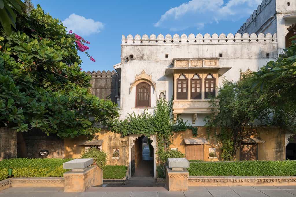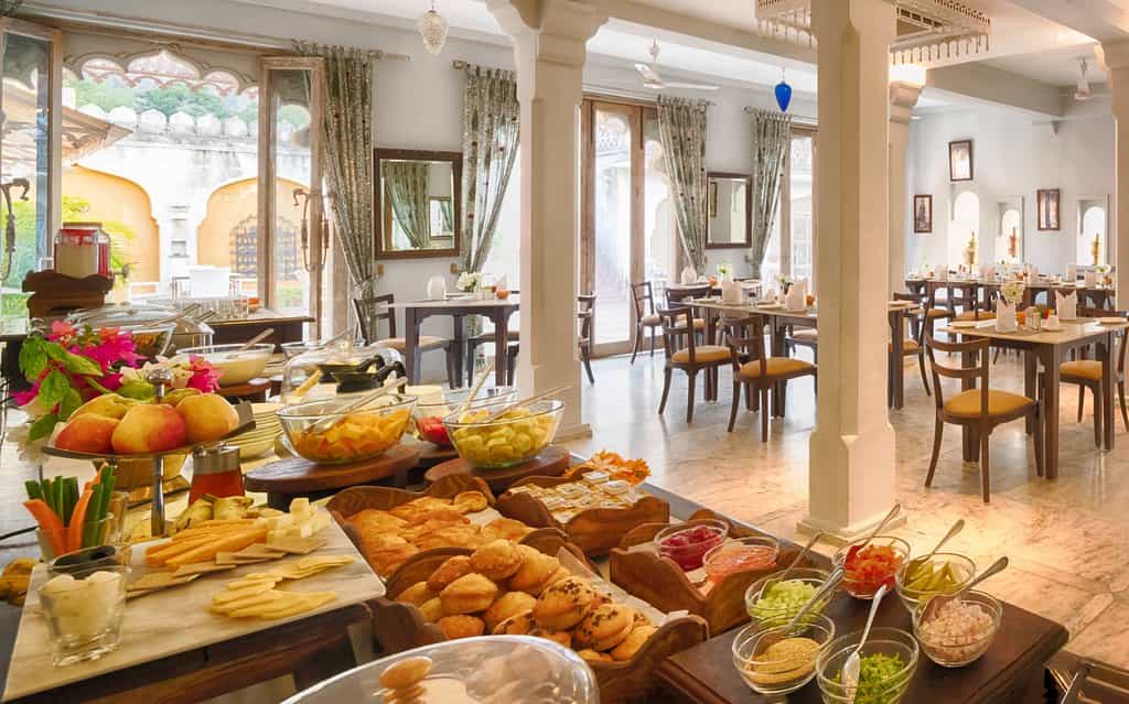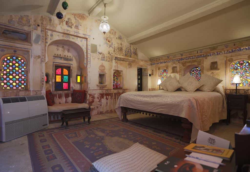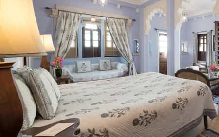 Set around a series of courtyards, Rawla has 32 rooms and suites, each with an en-suite. These range from rooms steeped in history, original frescoed walls and stained glass windows, to the hotel's new wing rooms where modern design pays homage to the hotel's roots with lattice work designs and carved arches. In shades of cream or powder blue, each room comes with a king bed, cushy window seat and patterned rugs. The Luxury Grand Heritage suites have a living area and terrace.
