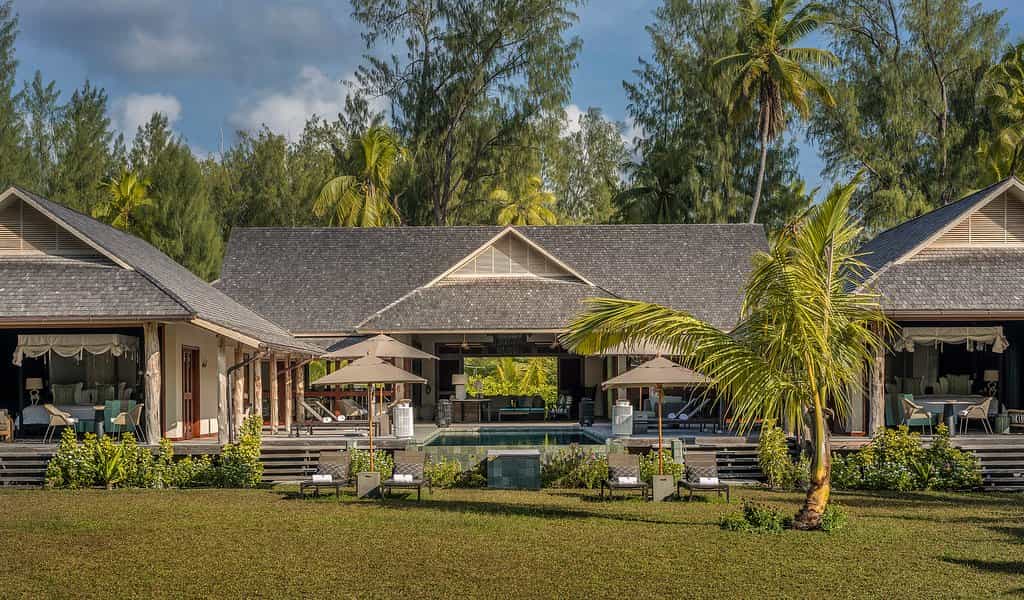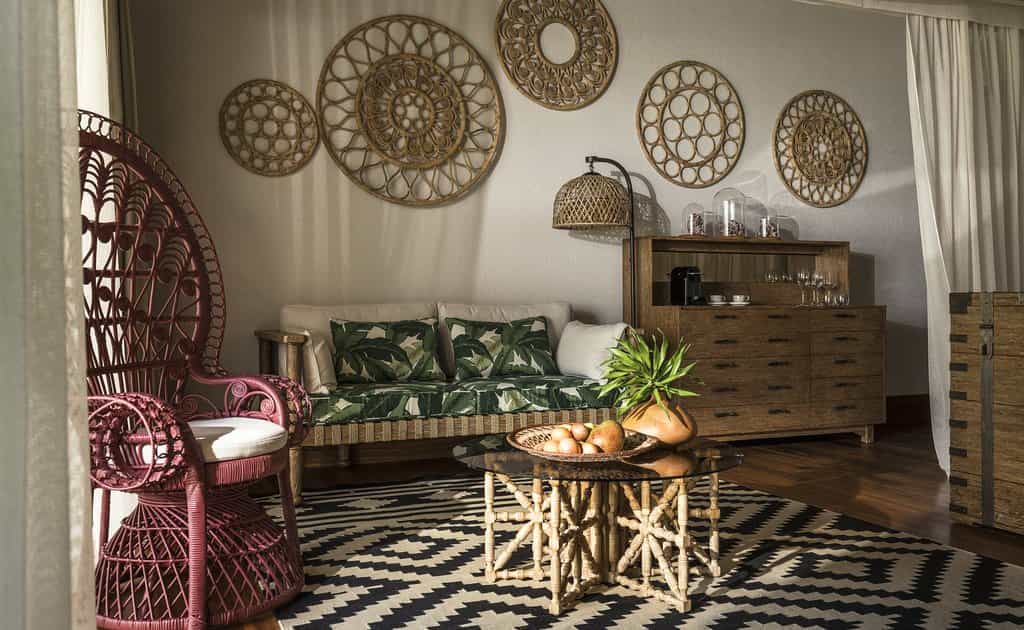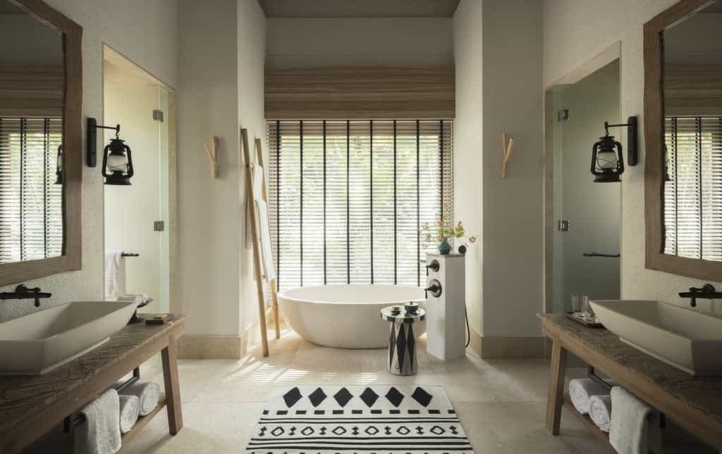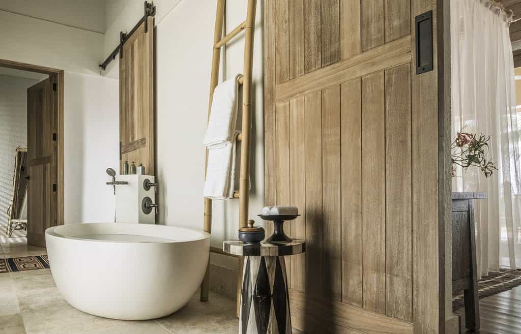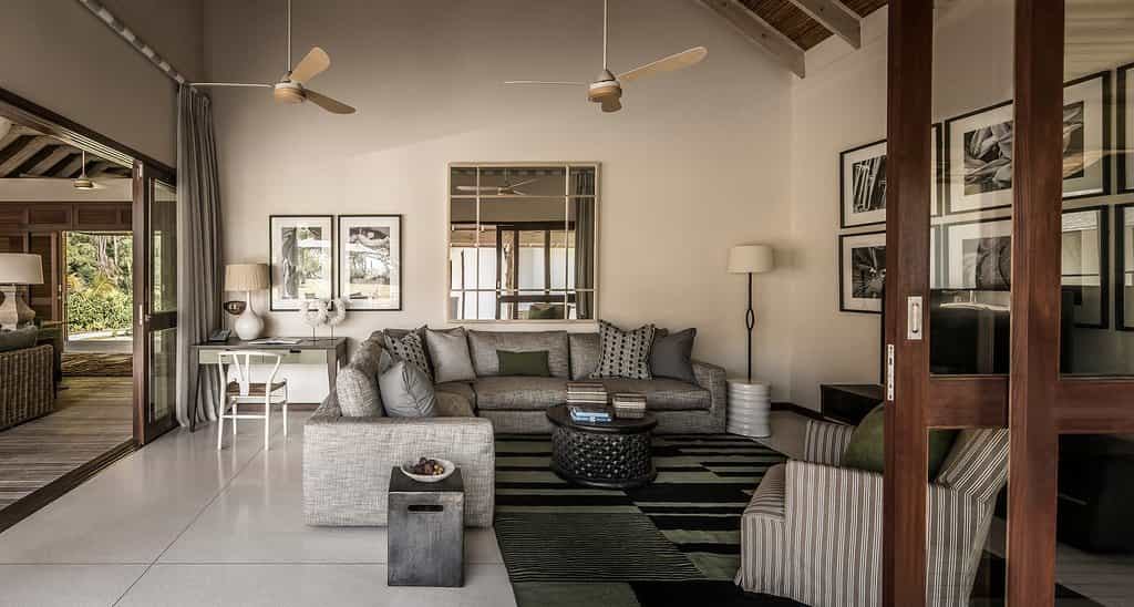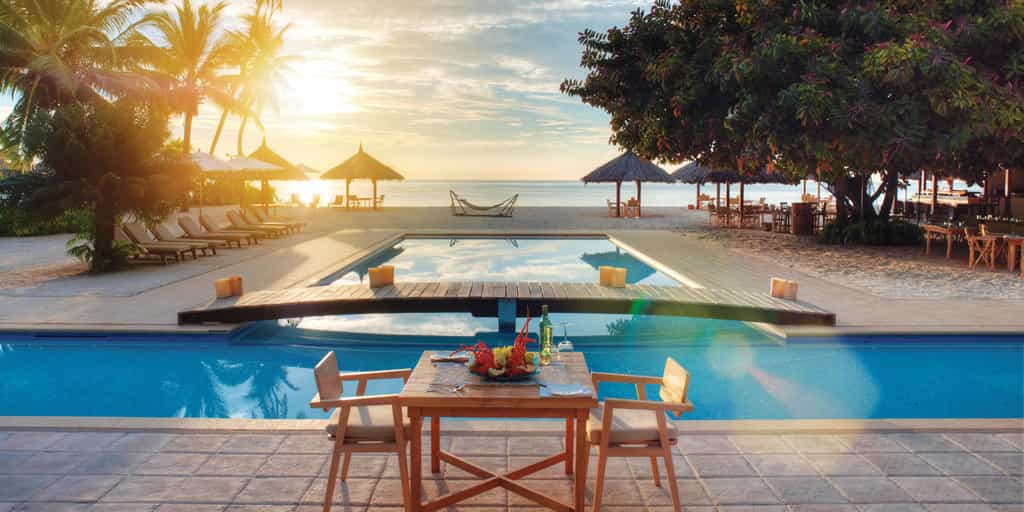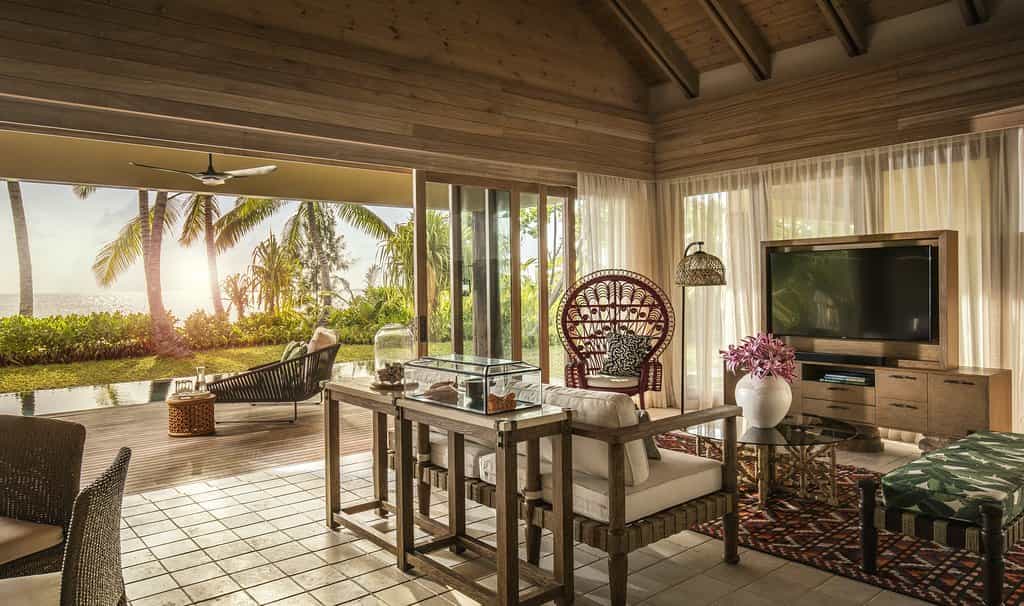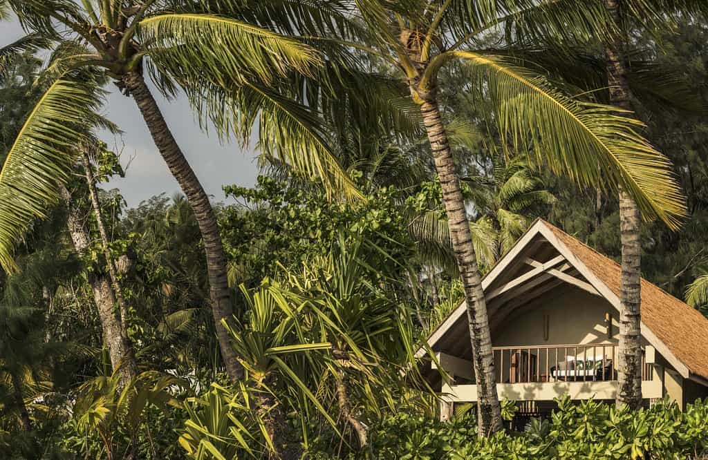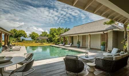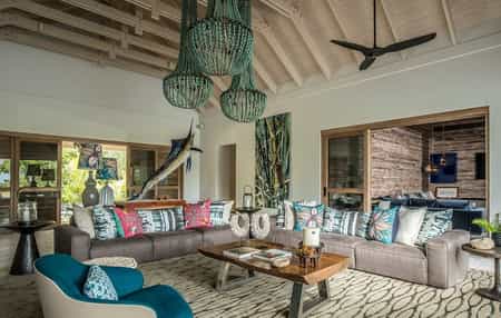 Understated colonial style meets natural island inspiration in the main part of the resort. There are two restaurants, a chic cocktail bar and outdoor sun deck overlooking the swimming pool and beach, and an open-plan lounge, all beneath traditional thatched ceilings that catch the tropical breeze. There are a number of spa suites tucked away in the gardens, plus a yoga pavilion and gym, a watersports centre, a floodlit tennis court, and an indoor games room.