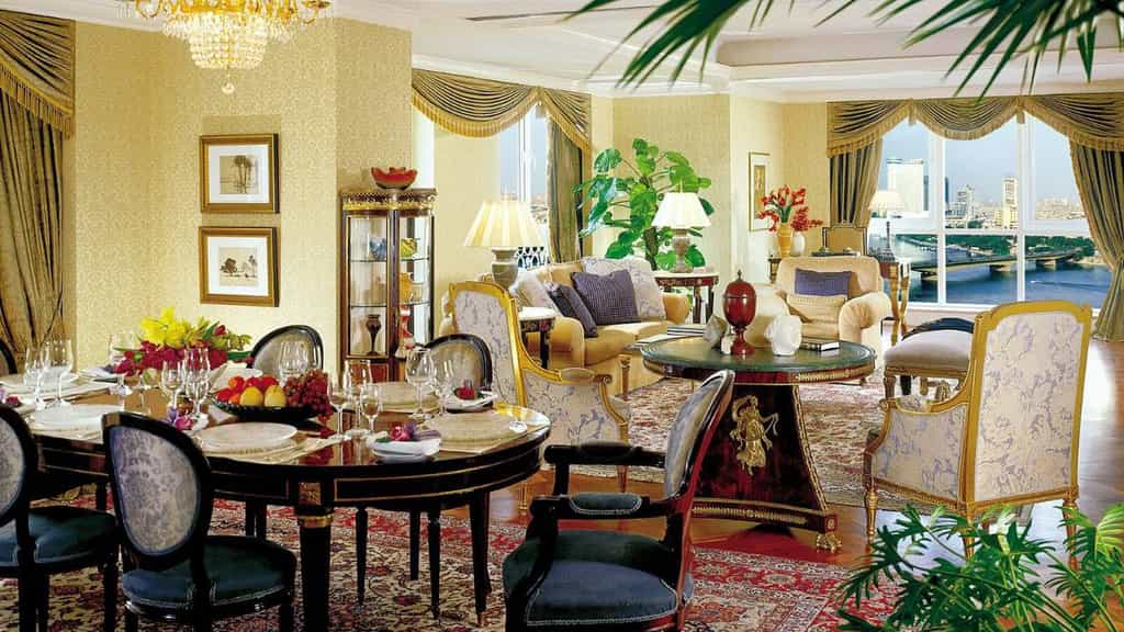 In soothing shades of cream, each room has soft, floral rugs, delicate artworks, and windows, showcasing views of the Nile, Botanical Gardens, and city. The bathrooms are equipped with L'Occitane toiletries and deep soaking tubs. The suites feature a spacious lounge decorated with bouquets by the in-house florist, and range from one to three bedrooms. Amenities differ but may include a private terrace, dining area and kitchenette, private bar, walk-in closets, and a state-of-the-art entertainment system.