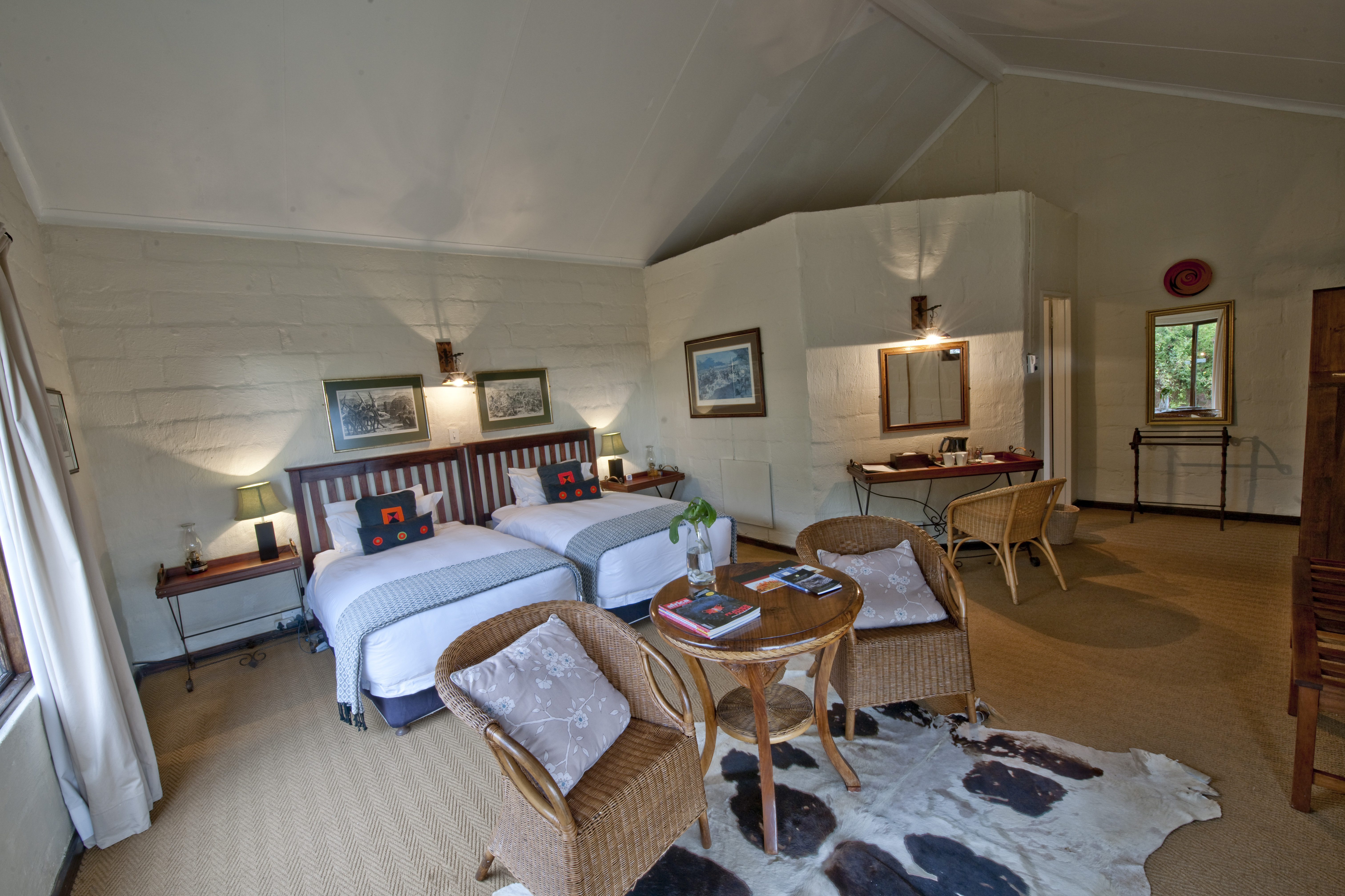 Six spacious, individually designed cottages are fitted with quality furnishings, historical details, generous double (or twin) beds, and an en-suite bathroom with a tub and walk-in shower. From private verandas, the views of the plains towards the Buffalo River Gorge are grand. Around the guesthouse is a pleasant garden with green lawns and mature trees – sit on your porch and birdwatch, or enjoy a whisky or two.