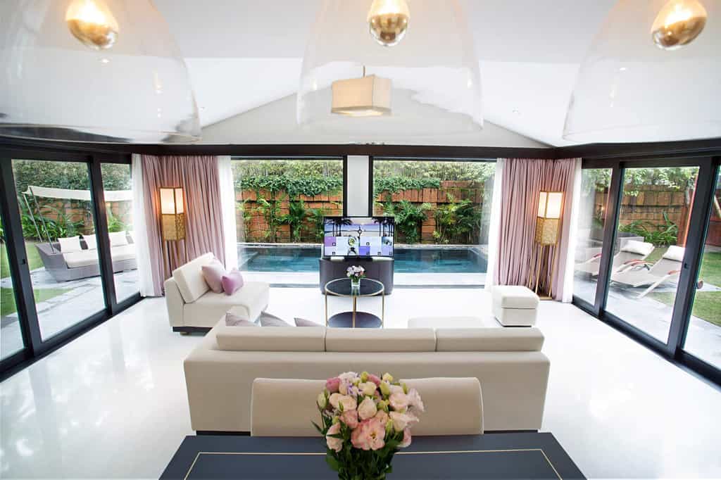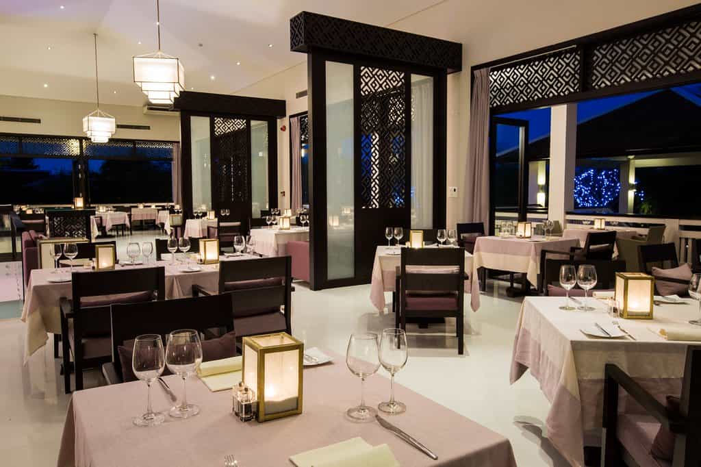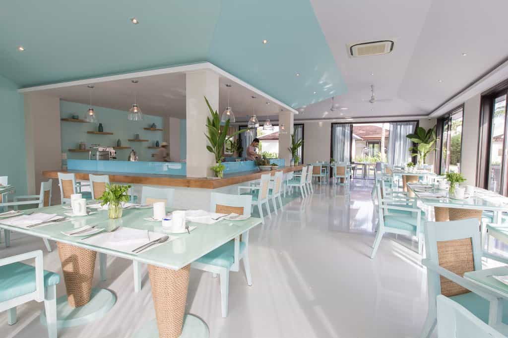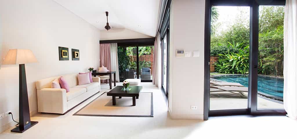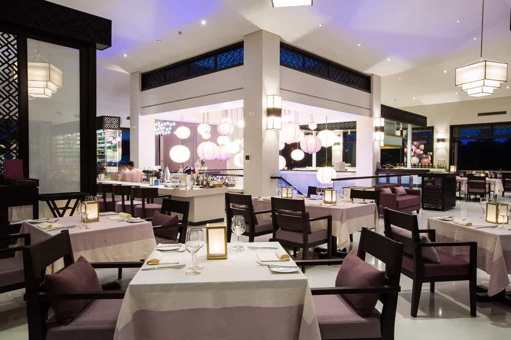 Strewn across the tropical gardens, there are 87 villas donning shades of purple and cream. Sliding glass doors open to reveal shaded loungers and a black granite pool. With similar interiors, there are also a number of bungalows divided into deluxe rooms. The style is fresh and bright, and each has a feather-soft bed and spacious sitting area, while the larger villas also feature a dining area and kitchenette. The bathrooms are sleek and glossy with large mirrors, a sunken bath and TV to watch while you soak.