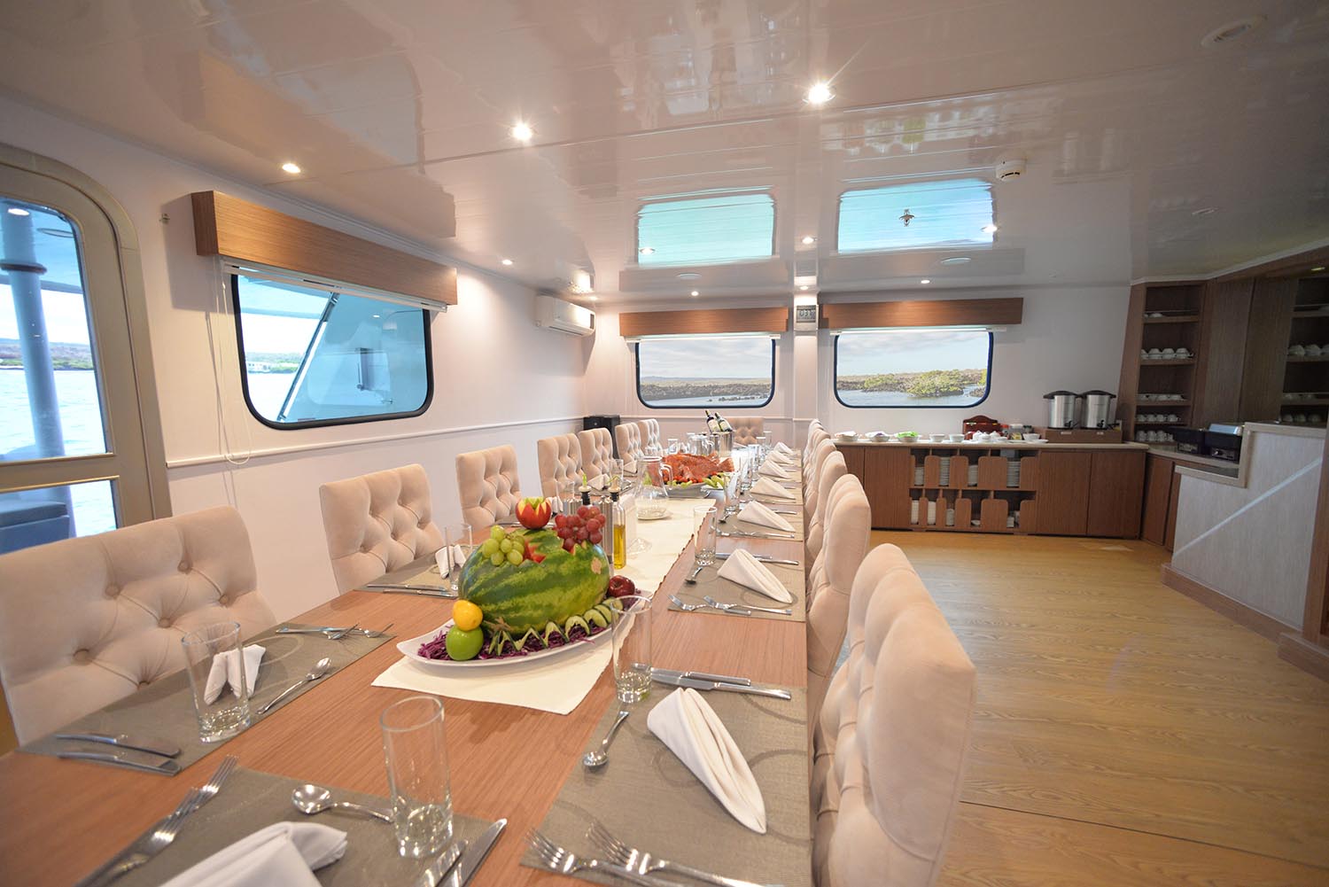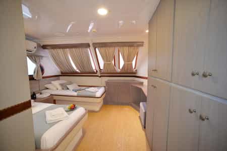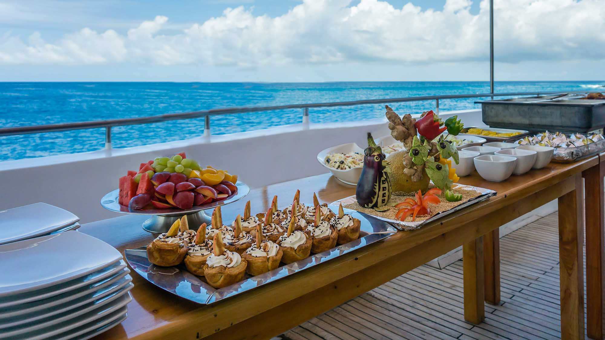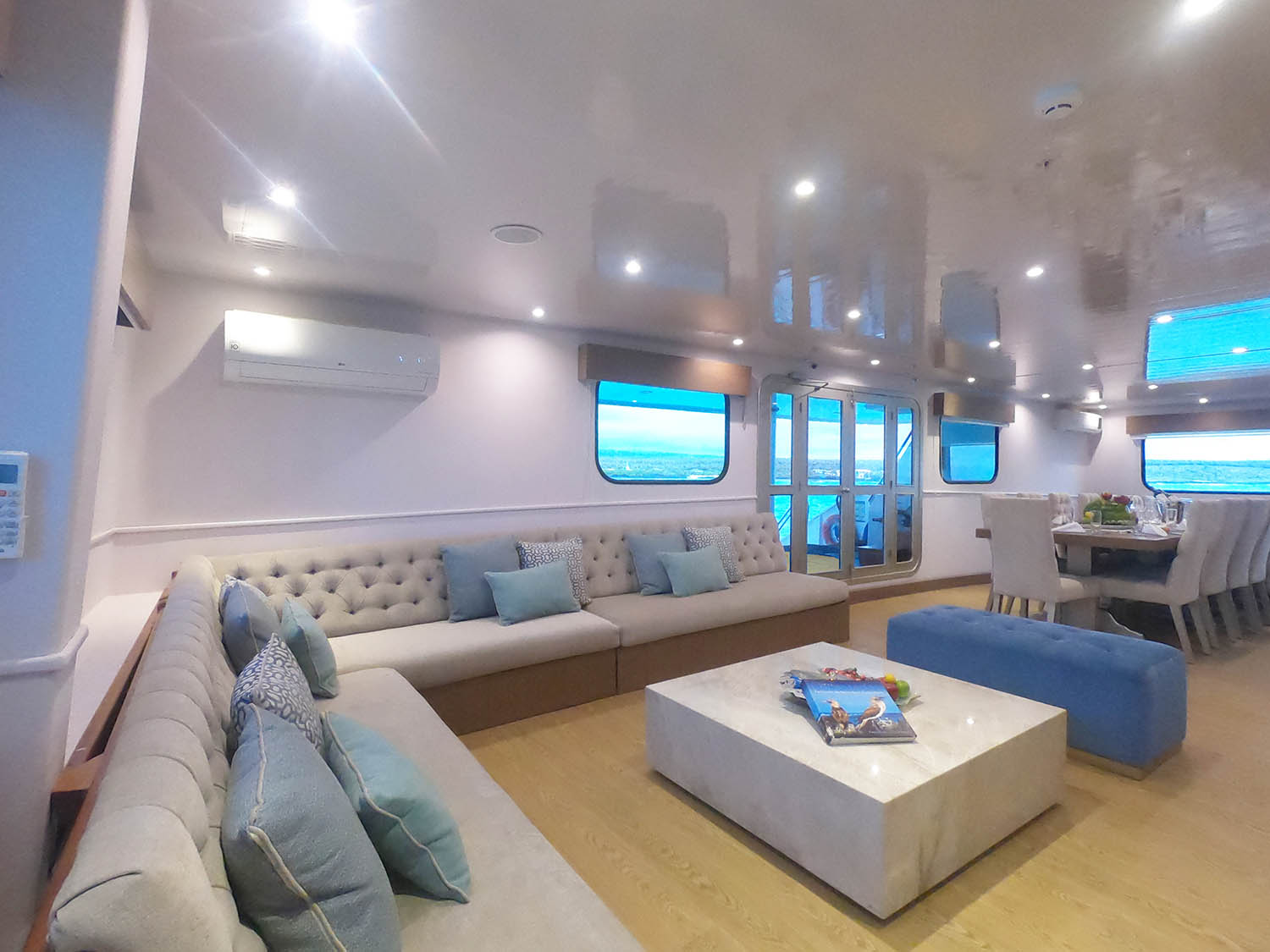 The vessel's interiors are decorated in soothing tones of cream and ice-blue, with polished teakwood floors and large picture windows throughout. In the elegant dining room, you'll enjoy a range of international and local cuisine - many of the ingredients are grown on their own organic farm and stocked up at the beginning of a journey. The piece de resistance has to be the netted viewing spots on the bow, however - the perfect spot for getting a close-up view of dolphins that often swim beside the catamaran.