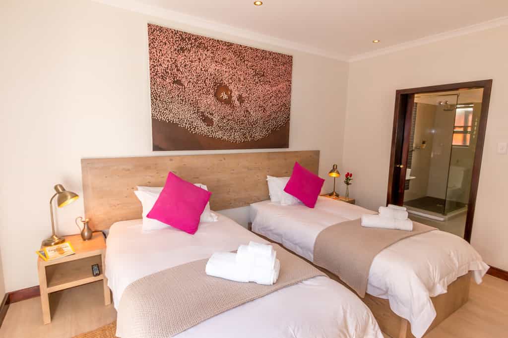 Just nine rooms (four double rooms, three twins and two for families) are spacious, with en-suite bathrooms featuring thick, fluffy towels, aircon, wi-fi connectivity and satellite TV. The modern minimalistic style continues in the neutral-coloured bedrooms rooms accented with bright pops of colour in the cushions. All are extremely comfortable and a stylish place to lay your head before or after adventures into Namibia's wilderness.
