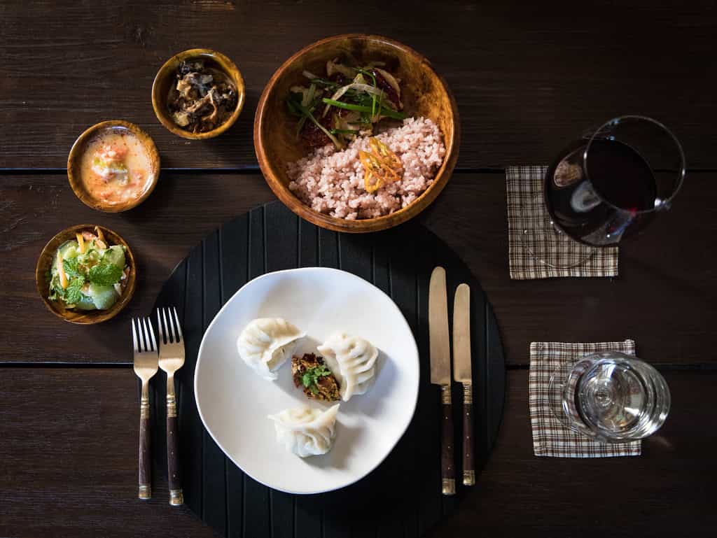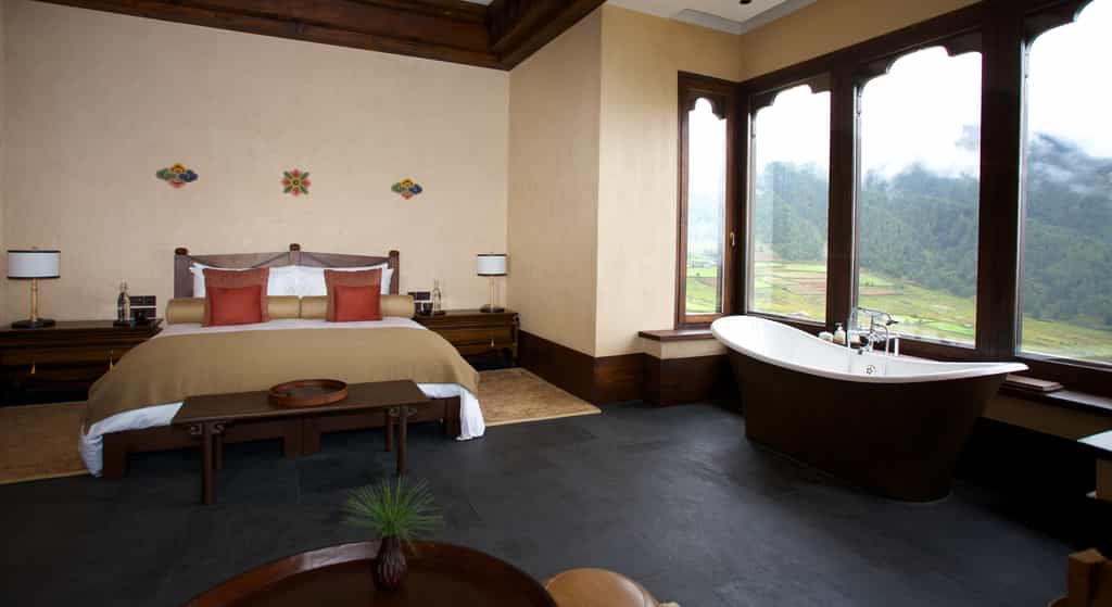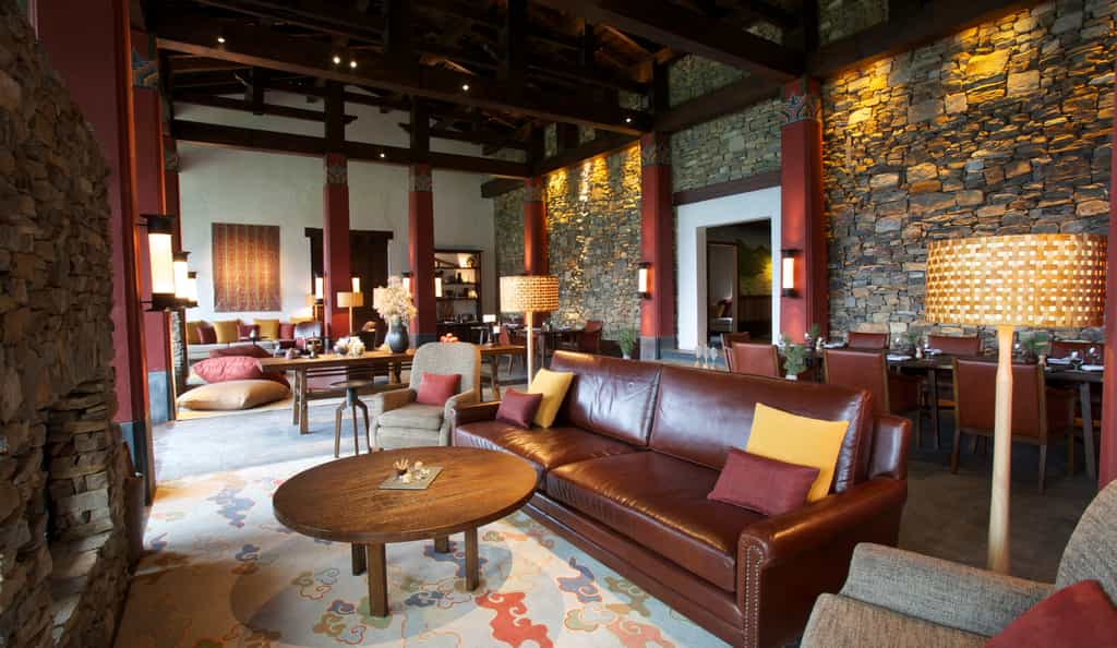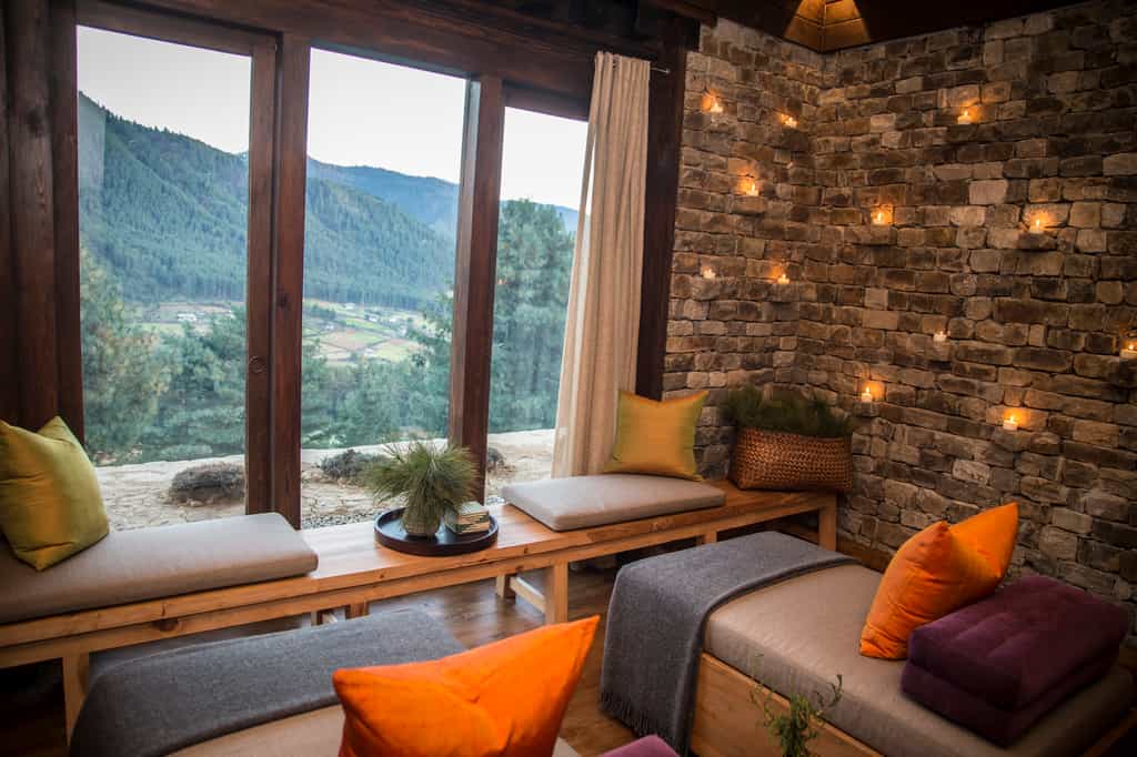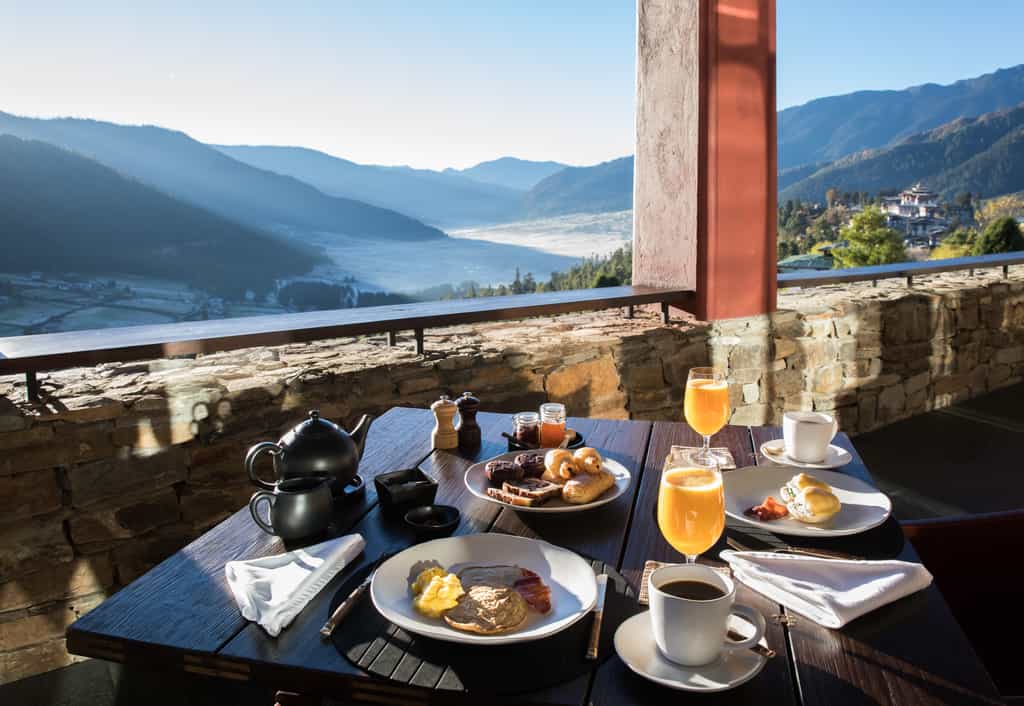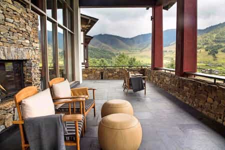 With robust red columns, dry-stone walls and large murals of the landscape, the joint lounge and dining room feels rather traditional. Locally-grown ingredients are used to whip up three-course dinners including specialties like the yak burger with local Gouda. Although there's no official bar, the wrap-around verandah serves wine and tea along with lovely views of the valley. Enjoy a soak in the Bhutanese hot stone bath or indulge in the menu of treatments from the comfort of your suite.