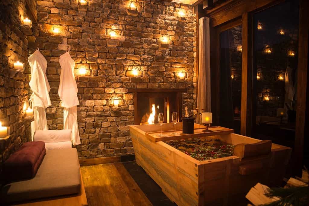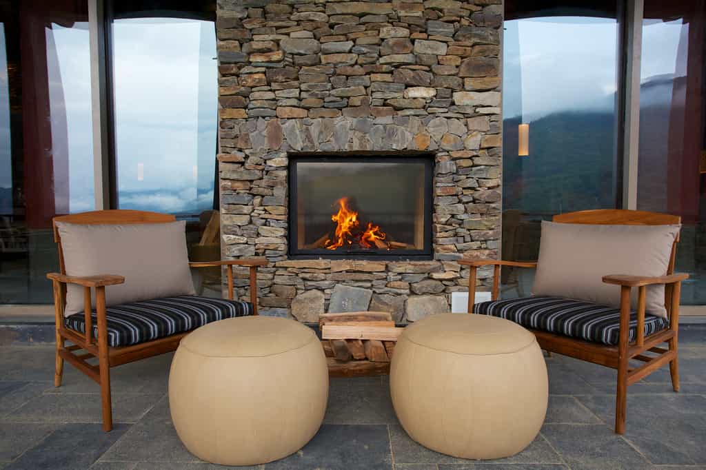Dotted across the grounds, the 12 suites have a soft and unfussy design. The king-size bed is decked out in muted colours with pops of red and heated pads are added at turn-down. The living area has a large corner couch facing the deep bathtub. A separate bathroom has a walk-in shower and wardrobe. In winter, the sleek fireplace bathes the room in warmth and the black slate floor is heated too. You might miss having a balcony but there are plenty of other spots to enjoy the view.