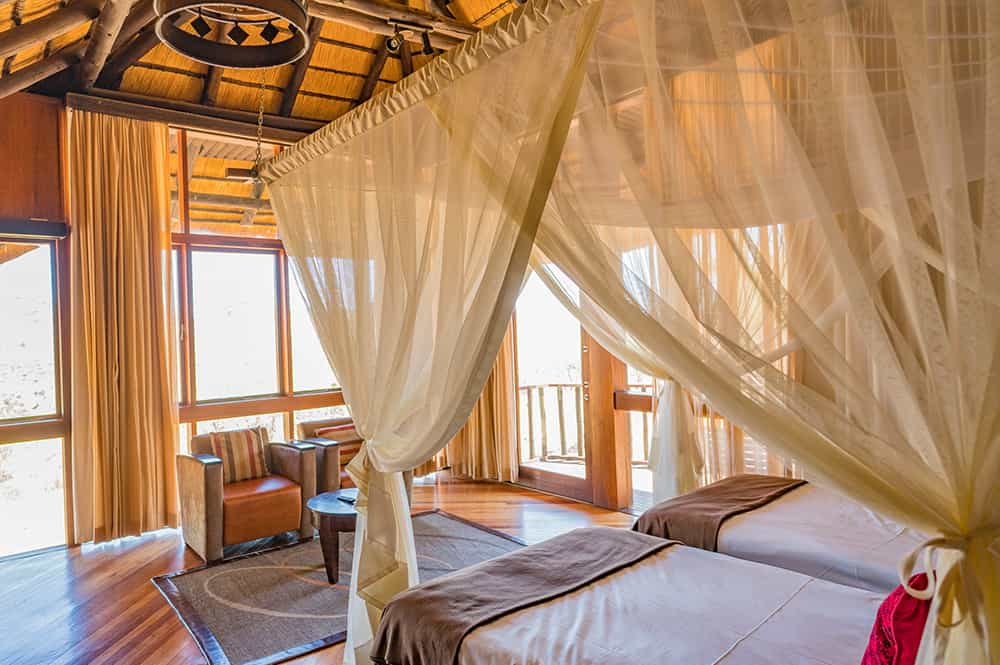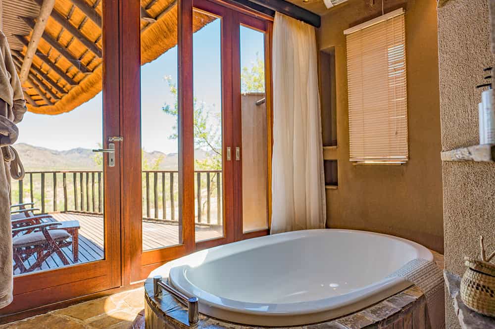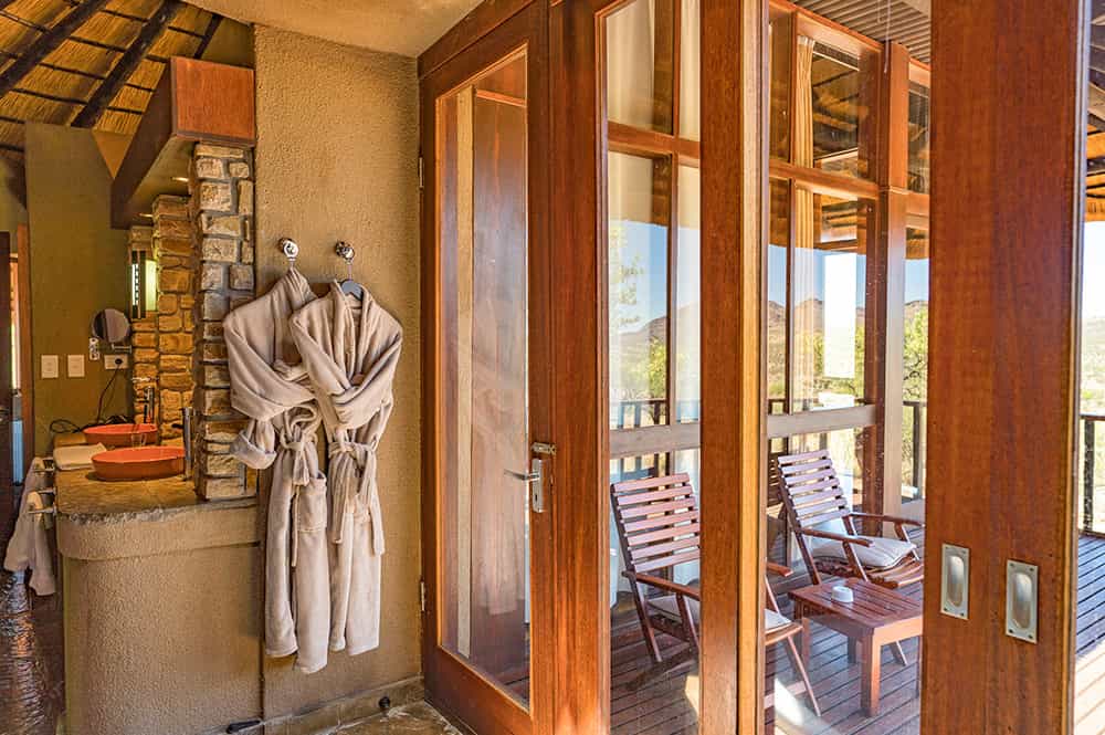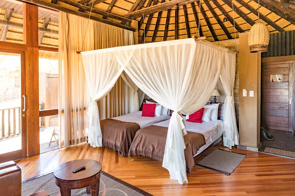 There are 15 double or twin thatch and stone bush chalets, and a 2-bedroomed family suite overlooking the reserve, with large private viewing decks to make the most of the spectacular sunsets. The African style extends to the interiors, with exposed thatch and beams, polished timber floors, and wraparound glass panels. All rooms are en-suite, with deep baths, and indoor and outdoor showers, while the family suite has two bathrooms. Modern luxuries include air-conditioning, an entertainment centre with Wi-Fi, a minibar, and a comfortable lounge area.