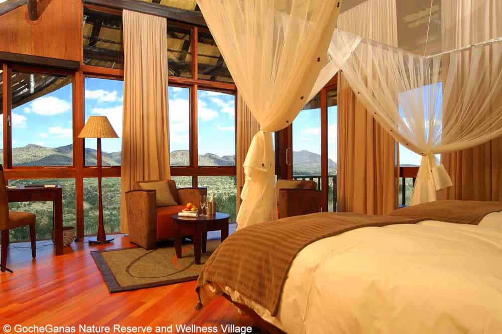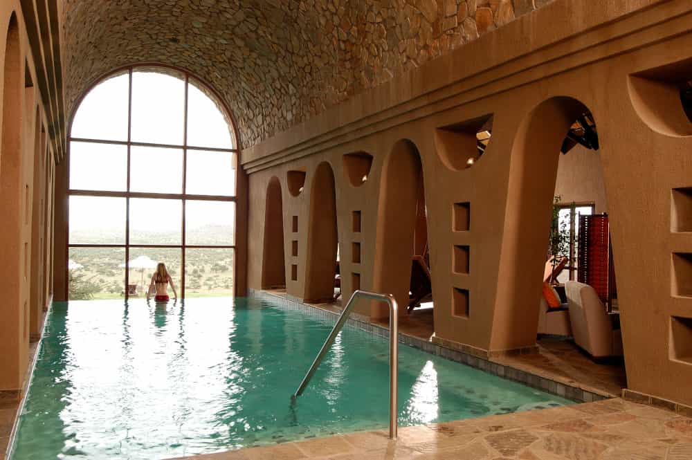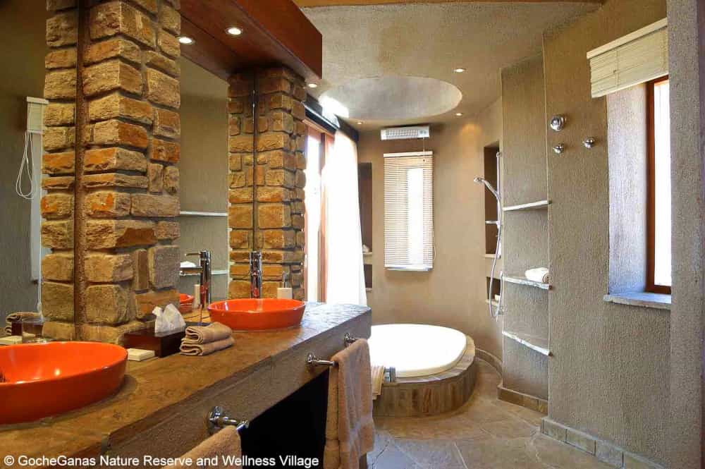 The charming main lodge sits on top of a rocky outcrop, with marvellous views over the game reserve. Its design is traditionally African, with rough stone walls, adobe finishes, and raised conical thatched roofs. The open-air restaurant and bar has a stunning stone-walled fire pit overlooking the valley, and there's an outdoor swimming pool fringed by emerald lawns. The adjoining spa has a fabulous heated indoor pool, a granite cave sauna, 11 state-of-the-art treatment rooms, and excellent gym facilities.