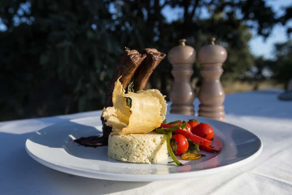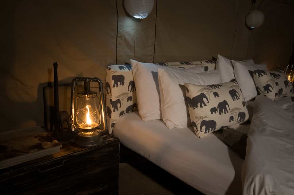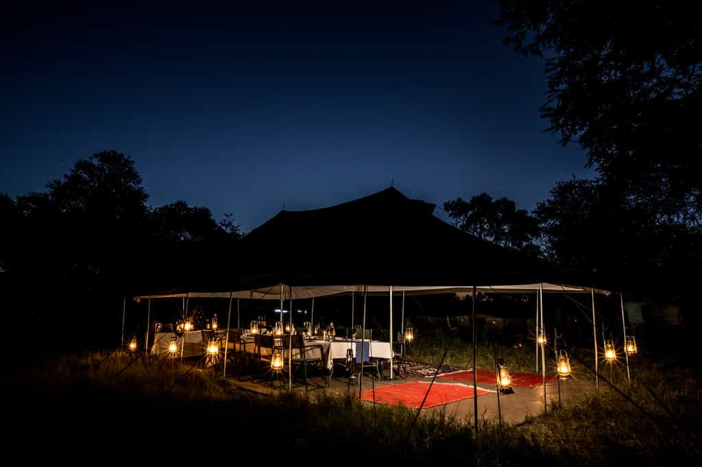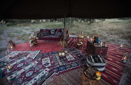 In the central canvas tent, there's a long, finely set dining table and at night, lanterns light your way. Outside, the campfire has an uninterrupted view of the stars.