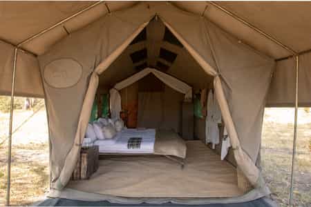 The luxury roving camps exemplify the height of bush comfort and exclusivity (the owners are consummate hospitality professionals). Whether on the edge of a lagoon in the Delta or in a scrubby thicket in the Kalahari, your tent travels wherever you go. The canvas, meru-style tents have a shaded porch that is furnished with a few camp chairs, perfect for lazy afternoons after busy mornings of game-viewing. Enter the mesh-zipper door and you'll find a comfortable super king sized bed, pleasantly made with good linens and heavy blankets. At the rear of the tent is a canvas alcove with a flushing toilet and a bucket shower for an authentic bush experience.