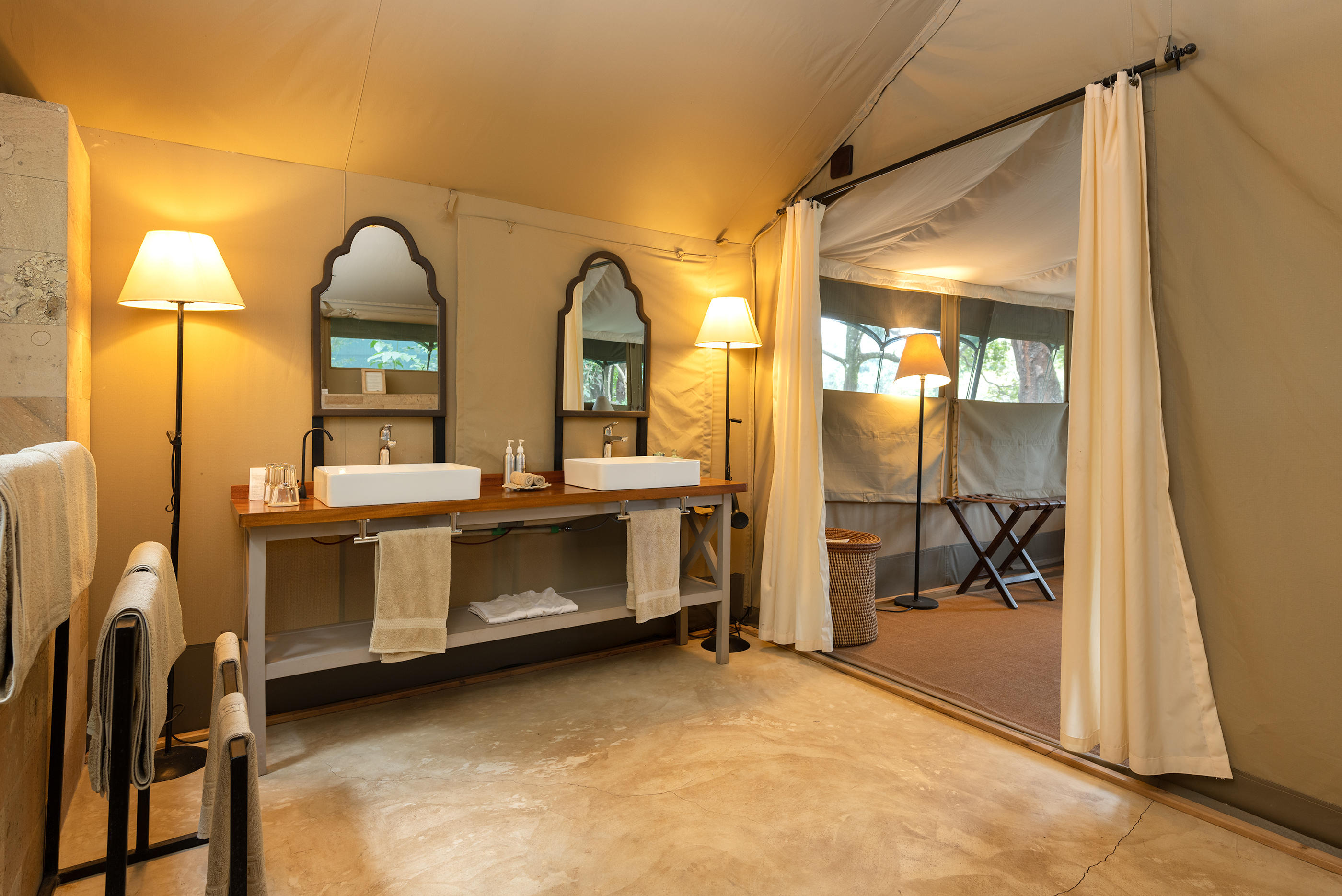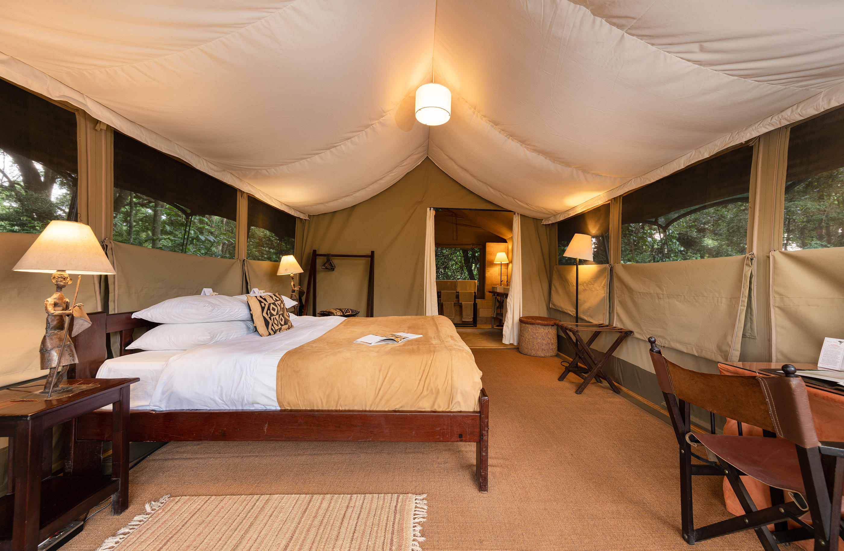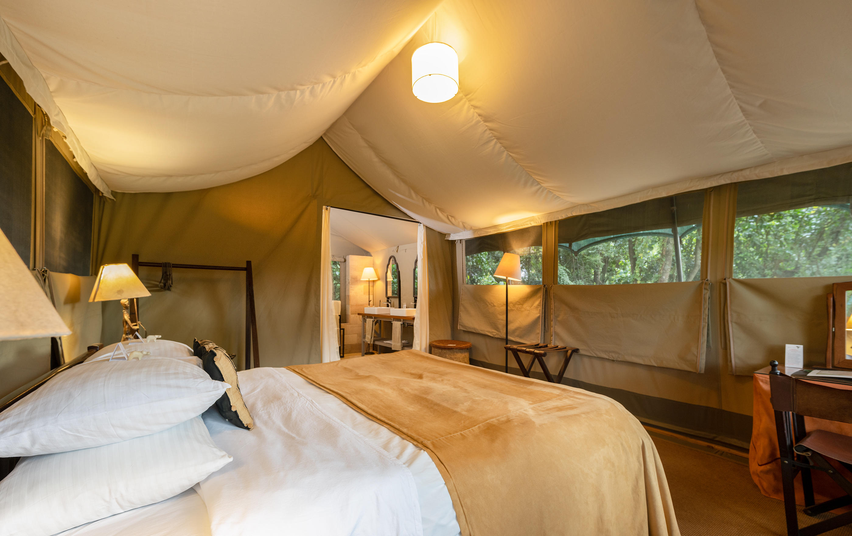 There are actually 24 rooms (including 5 family tents) at Governors' Camp, but you really wouldn’t know it. Each canvas tent is a considerable distance from the next and hidden amongst the trees for maximum privacy. Inside, there are either king or twin beds and the beige canvas and pretty African textiles create a light, airy atmosphere. The en-suite bathrooms are big and the verandas at the front look out either over the river or the surrounding plains – both are fabulous.