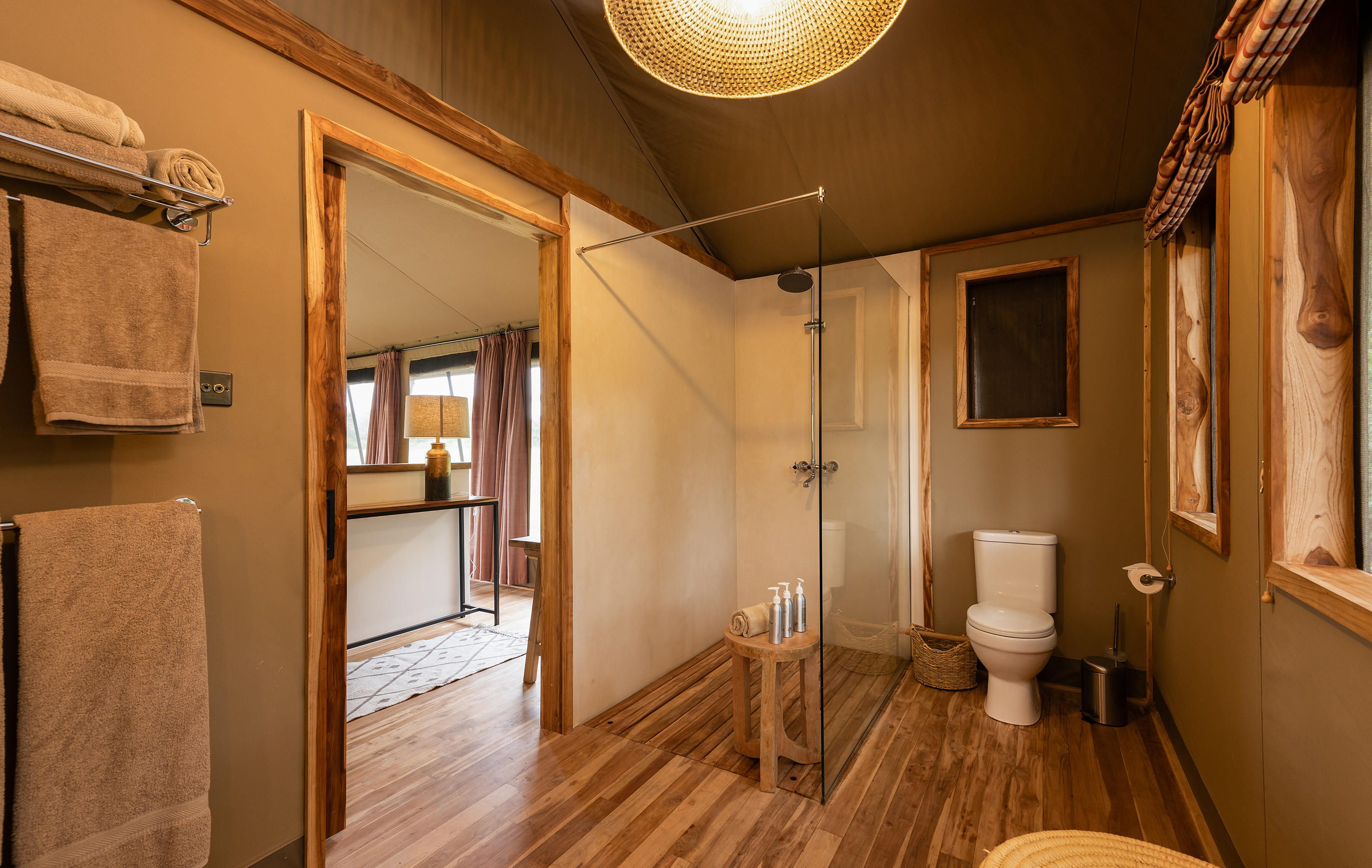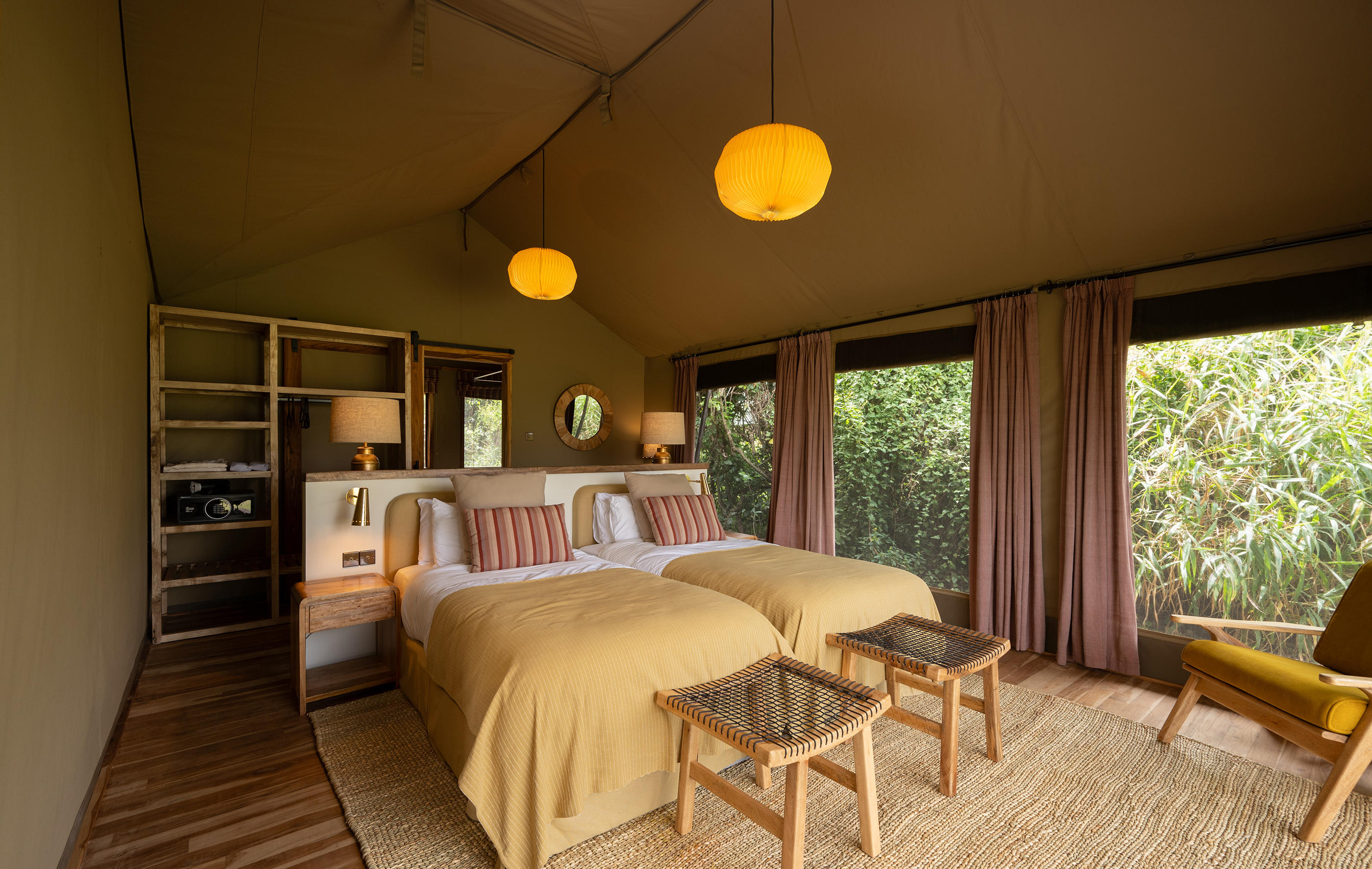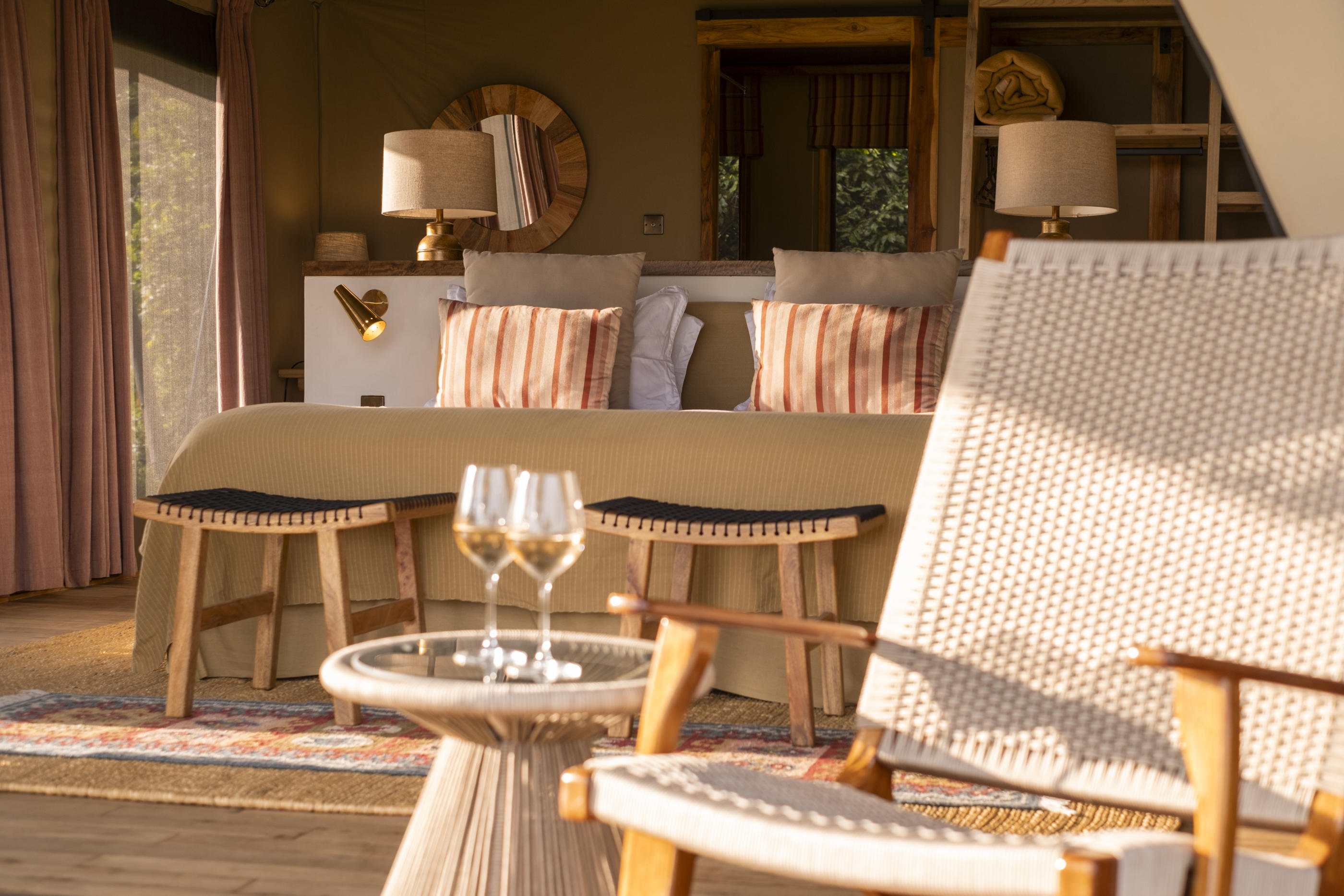 There are actually 24 rooms (including 5 family tents) at Governors' Camp, but you really wouldn’t know it. Each canvas tent is a considerable distance from the next and hidden amongst the trees for maximum privacy. Inside, there are either king or twin beds and the beige canvas and pretty African textiles create a light, airy atmosphere. The en-suite bathrooms are big and the verandas at the front look out either over the river or the surrounding plains – both are fabulous.