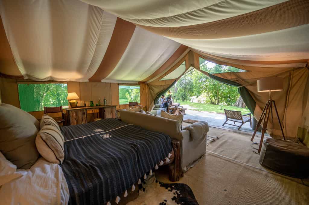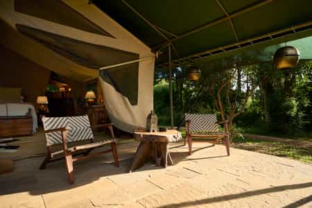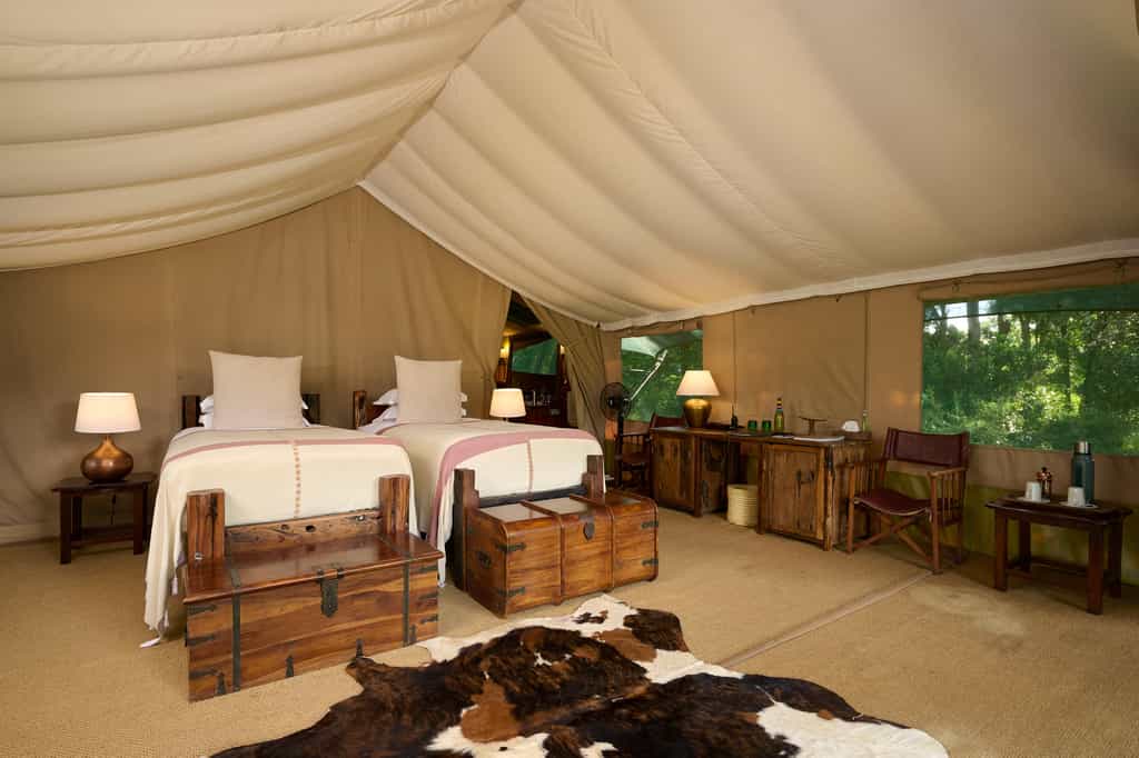 Recently reduced from 20 to 10 to lessen the impact on the environment, the Meru-style tents are perfectly positioned along the Mara River for ultimate (and private) wildlife-watching. Relax in the hammock on the veranda or settle down in a chair and get serious with your binos for the perfect afternoon siesta. Inside, hand-carved, olive wood furniture is elegant yet functional and the bathrooms are enormous and come complete with delectable toiletries and vast free-standing bathtubs, as well as hot showers.