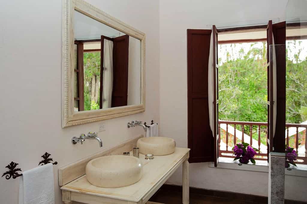 In the manor house, a grand staircase leads to seven guestrooms, while there are a further 10 rooms in the garden cottages. Each is individually designed and features a large, plush bed, framed floral sketches and delicate accoutrements. Colourful details add a unique touch, inspired by the family's artistic traditions. The en-suite bathrooms have rainfall showers, ornate mirrors and dual basins. The in-house rooms have a more heritage feel with heavy wooden shutters, while the cottage rooms are lighter with wide windows and private patios.