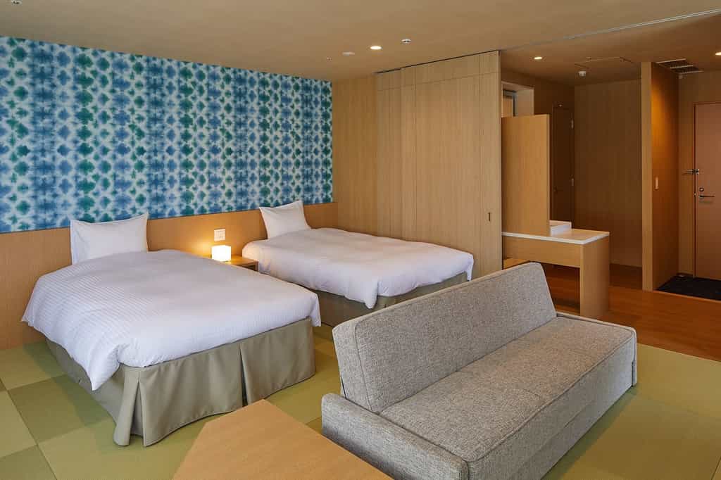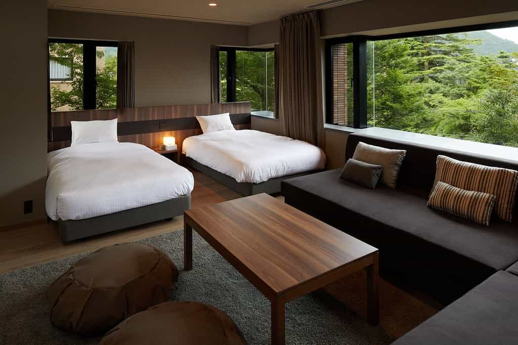 Choose your adventure: 62 hotel-style rooms in the East and West buildings, or 10 apartment-style condominiums. Hotel rooms blend tatami floors with Simmons beds in a modern Japanese aesthetic, though the semi-doubles lack bathrooms entirely (you'll use the public baths). The real stars are the condominium units – spacious living areas with proper kitchens (induction hob, full cookware, proper fridge), and the pièce de résistance: private view baths with constantly flowing hot spring water. The largest sleeps six and spans 70 square metres with a balcony. Yes, you'll make your own bed if using the sofa bed, and yes, the elevator only reaches the third floor, but having your own hot spring on tap at 3am rather makes up for it.