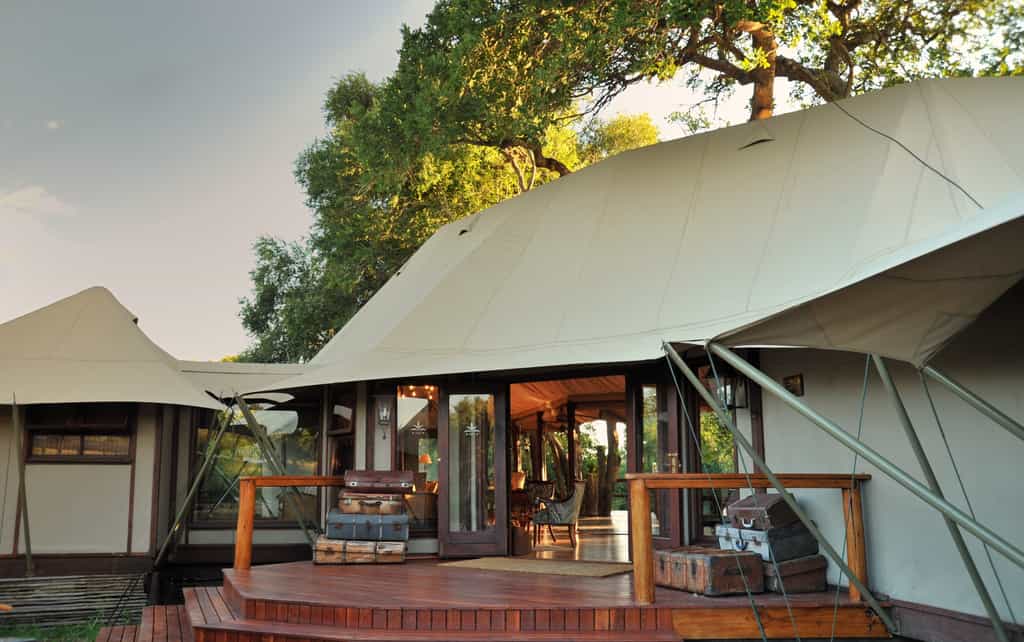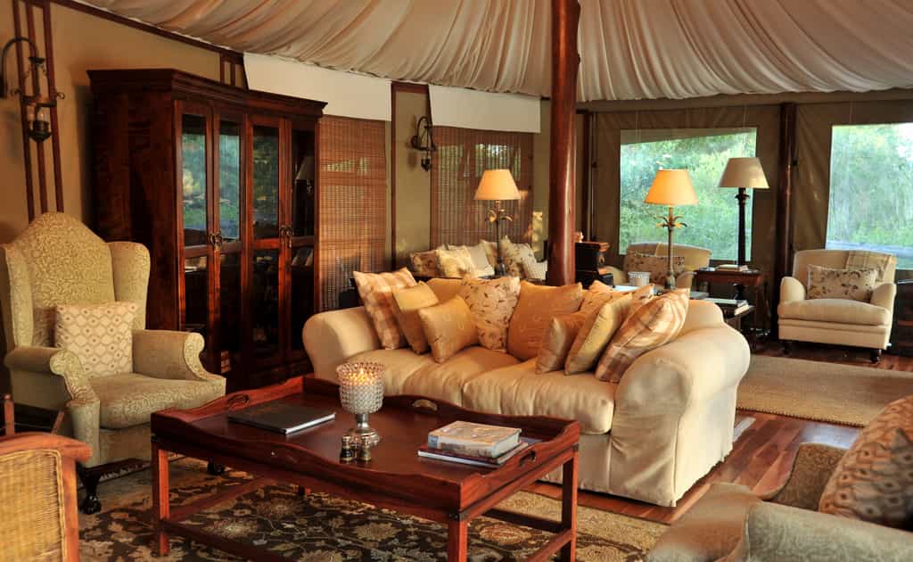 Each of the six en-suite canvas tents is beautifully situated along the river, with private decks in secluded spots beneath the trees, and linked to the main area via raised wooden walkways. Spacious interiors with burnished teak floors and vintage decor give a feel of safaris of old, with crisp white linens and opulent drapes adding a romantic twist. Modern comforts, including air-conditioning and electricity, plus an outdoor shower, tick all the boxes for a luxurious safari experience.