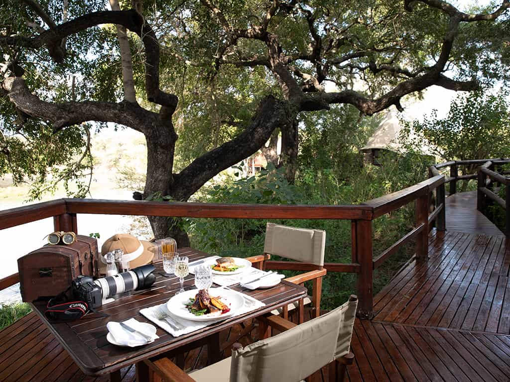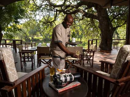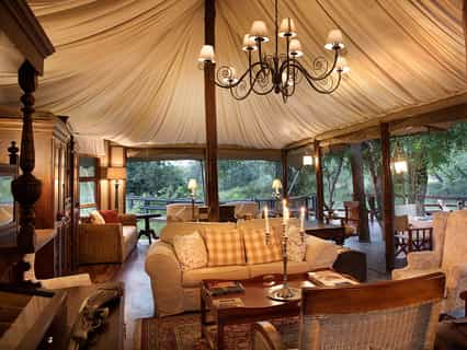 Beneath a canopy of magnificent jackalberry trees, the main tented area faces out across the seasonal river, with open sides leading down to the surrounding bush. Raised decks make the perfect spot to look out for game while tucking in to a delicious meal - the camp is unfenced, and wildlife frequently passes by at close quarters. Between game drives, relax around the swimming pool during the heat of summer, or find a quiet spot in the lounge.