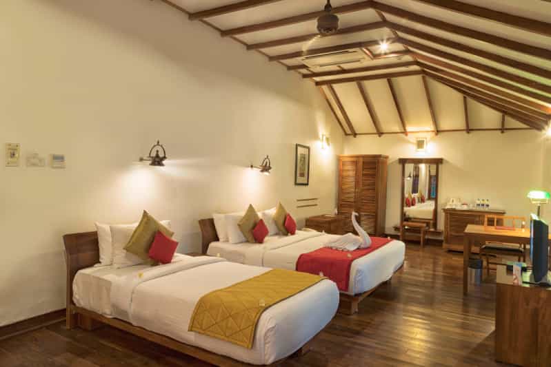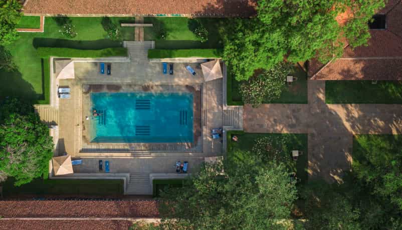 Heritage Madurai has quite the selection of rooms and suites. Each comes with a king-size bed with pops of colourful scatter cushions, a mini bar, living area and elegant en-suite bathrooms. The villas have an open-plan design with floor-to-ceiling windows, a courtyard and private plunge pool under frangipani trees. The Geoffrey Bawa Room features original honey-coloured granite flooring, and the Deluxe Club rooms have traditional window lattices, a natural motif and expansive verandas overlooking the garden.
