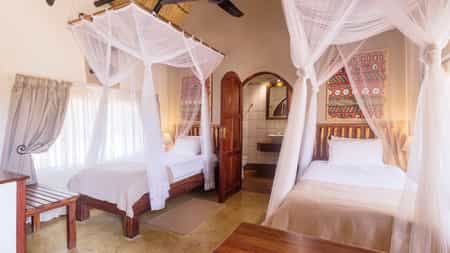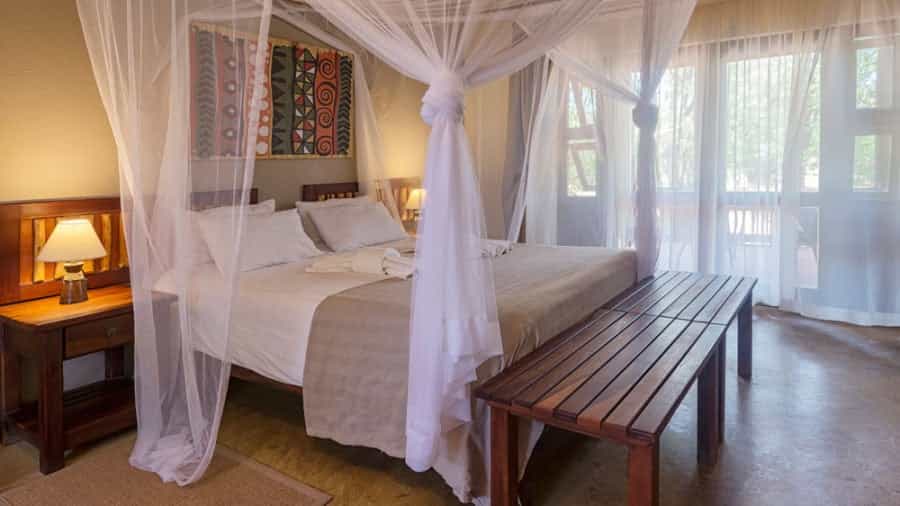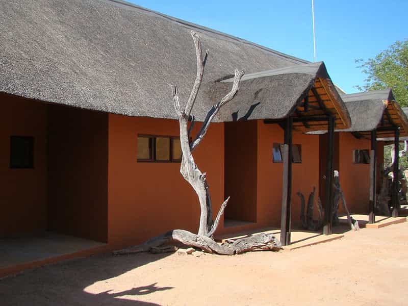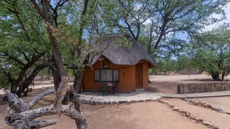 There are twelve comfortable but modest rooms at Hobatere - six individual terracotta thatched chalets and six terraced rooms. The chalets are compact with two twin beds and a small bathroom with basin, shower and toilet. There's a ceiling fan, though it only works when the generator is turned on. The terraced rooms sit closer to the main area and are larger, all with a double bed and some containing a third, single bed. Bathrooms are also larger, but with all the same amenities. Double doors open out onto a deck, furnished with two cushioned chairs.