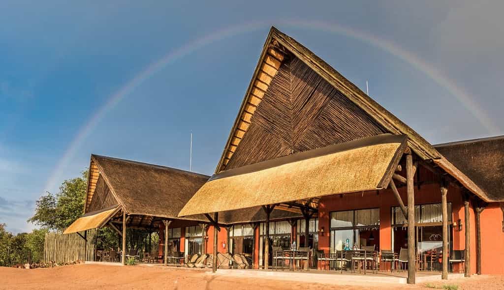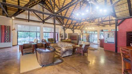The spacious open-plan main area incorporates modern design (polished concrete floors, exposed rafters, floor-to-ceiling windows and colorful accent walls) with uniquely African touches (a thatched roof, cowhides, a few tasteful animal heads and a wooden chandelier). Here you'll find a reception desk, curio shop, lounge/dining room and bar. It's a lovely, cool and comfortable place to sink into a big leather sofa and read a book, or pull up to the V-shaped wooden bar counter. In the adjoining dining room, breakfast and dinner are served as buffet while lunch is a la carte. Just outside the sliding glass doors is the shaded verandah with plenty of al fresco seating; just beyond this is a fire pit and even further, a waterhole. The swimming pool is surrounded by a rare patch of grass, and is accompanied by a raised stone deck with sun loungers.