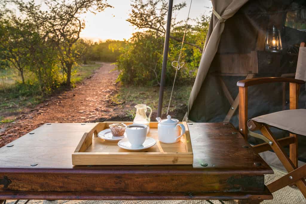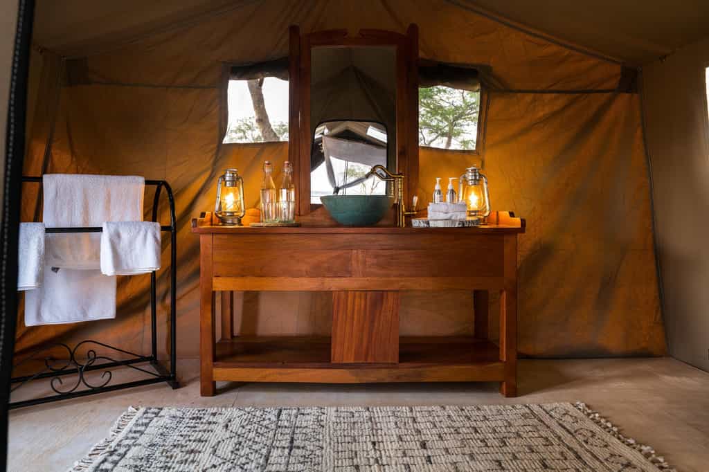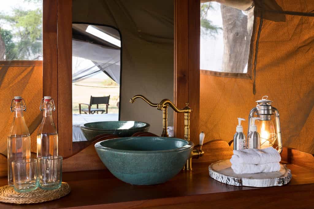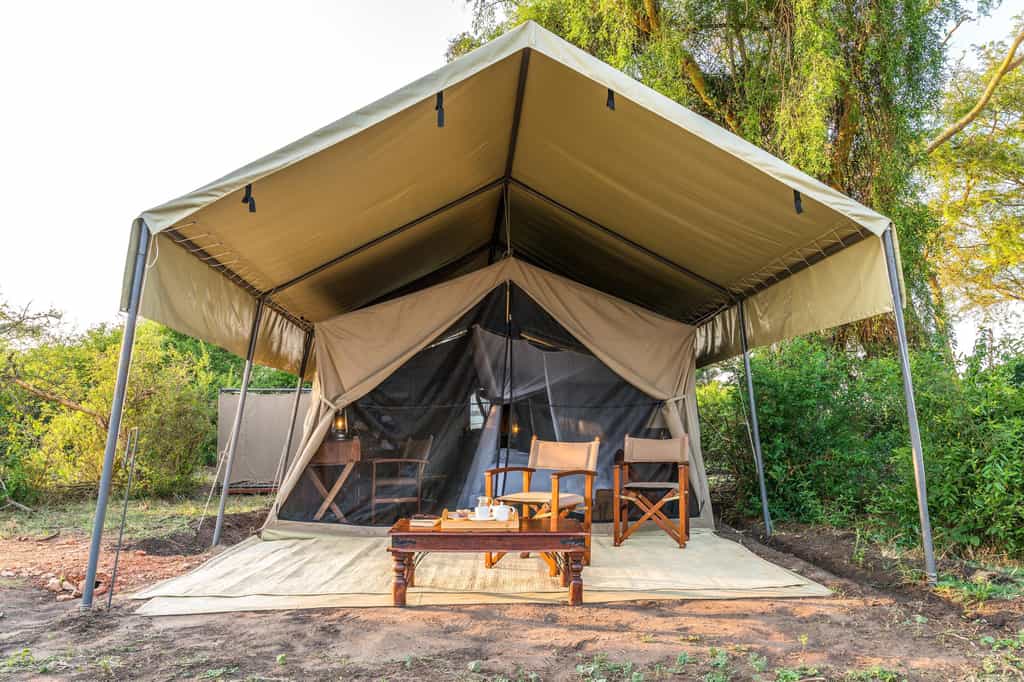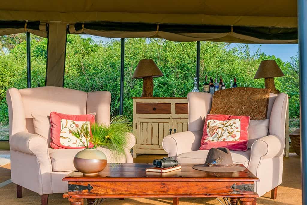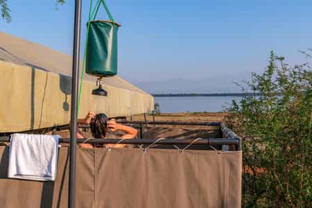 The main mess tent channels classic safari elegance with its airy dining area and comfortable sitting room, all designed to frame those spectacular views. Expect beautiful fabrics, vintage furniture and creative touches that give the camp its character - this is Wildplaces Africa after all, where every piece of furniture has a story to tell. The dining is spot-on too, with meals served either in the main tent or on the deck overlooking the water, where you can watch elephants taking their evening bath while you tuck into dinner.