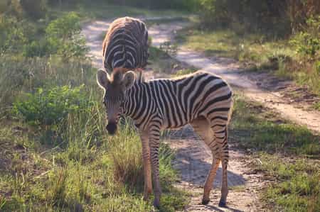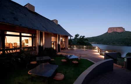 The main area is a tall thatched building with tiled floors and fine furnishings. The lounge and adjoining dining room have a comfortable, if rather formal, atmosphere. The well-stocked cellar certainly lightens the mood, with wine tastings, while an upstairs lounge makes for a quiet reading room. Most activity goes on outside though, with meals often served on the patio or in the garden, and a swimming pool with a spectacular view of the reserve.