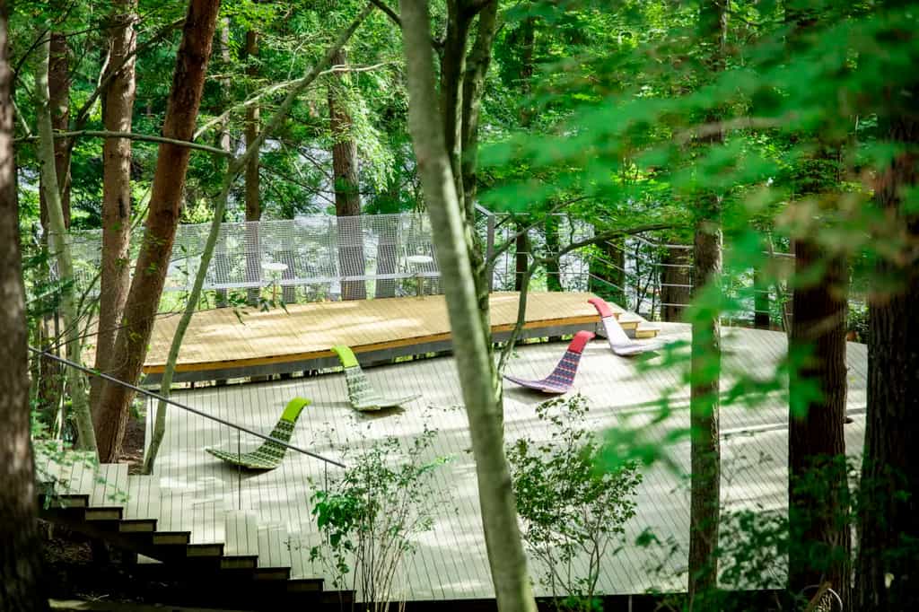 Nestled amongst the trees, the 'Cloud Terrace' is a network of wooden walkways and platforms, perfect for morning stretches, as well as alfresco sitting areas with stretched canvas roofs and hammocks hung between the pines. There's also a cosy library with a crackling wood-fire stove for the winter months. Further down the hillside, the restaurant serves imaginative versions of Japanese classics, all prepared in the open kitchen. Enjoy breakfast here or grab a quiche, freshly baked in the outdoor oven.