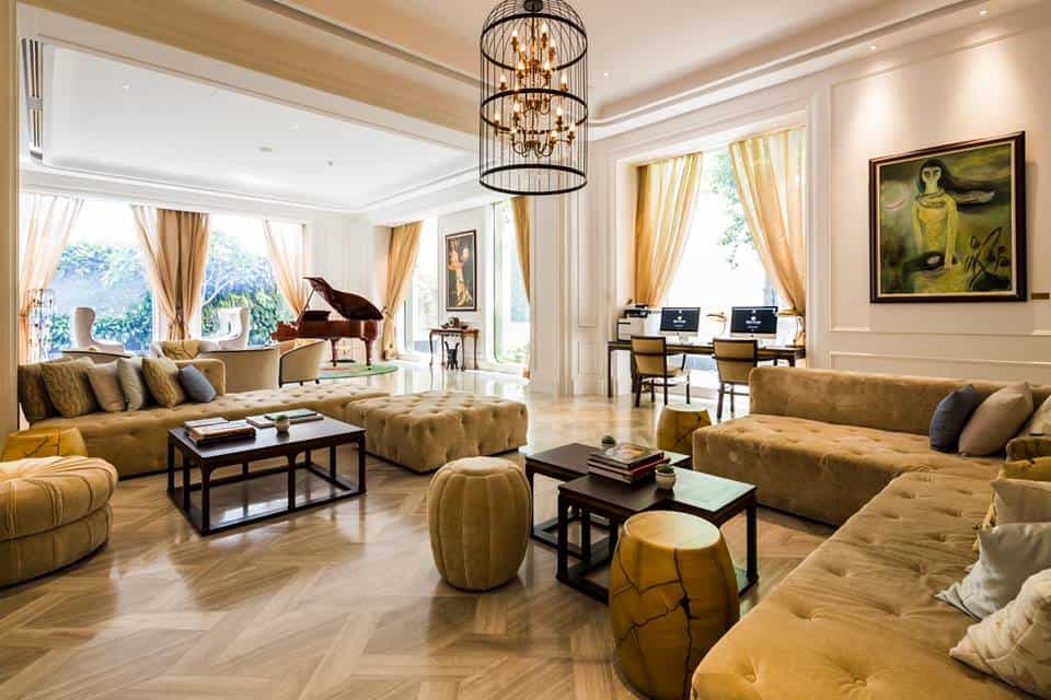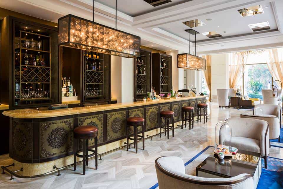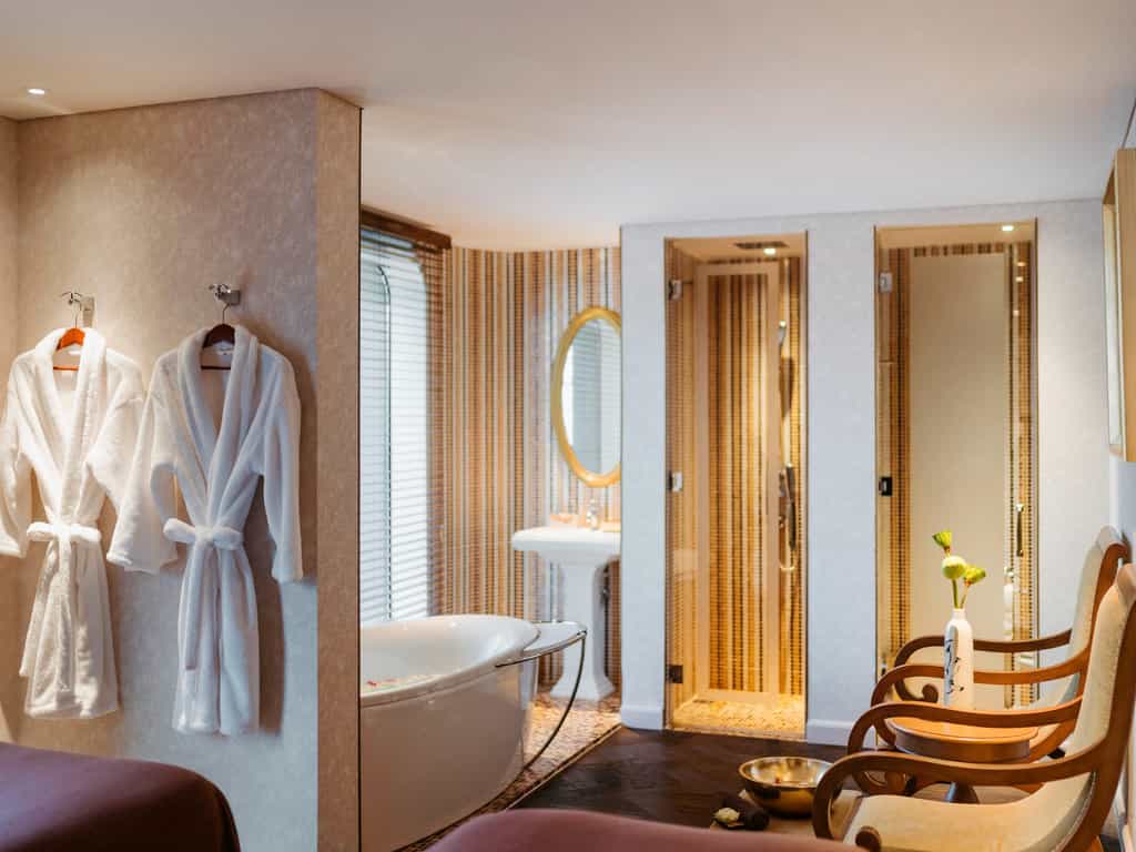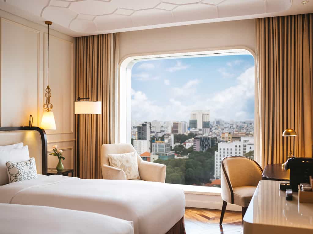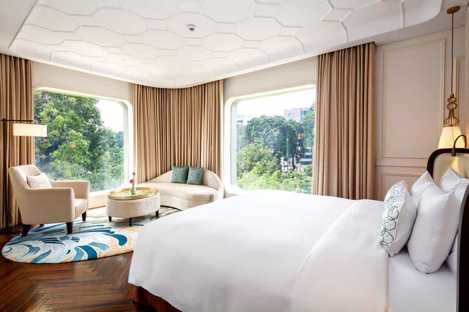 The rooms are a delight, with cloud-like beds, hand-crafted couches and rosewood parquet floors topped with suede floral rugs. Massive windows let in views of the gardens and city, which can be enjoyed from the plush lounge. Heavy drapes separate the bathroom, which is decked out with marble counters, tall mirrors and, in the larger rooms, a red Victorian tub. Furnished with simple gold lamps, gilt-framed TVs, a Nespresso machine and oil paintings, the suites are lovely but understated. The Sky Executive Suites have a private reception, exclusive wine evenings and high tea.