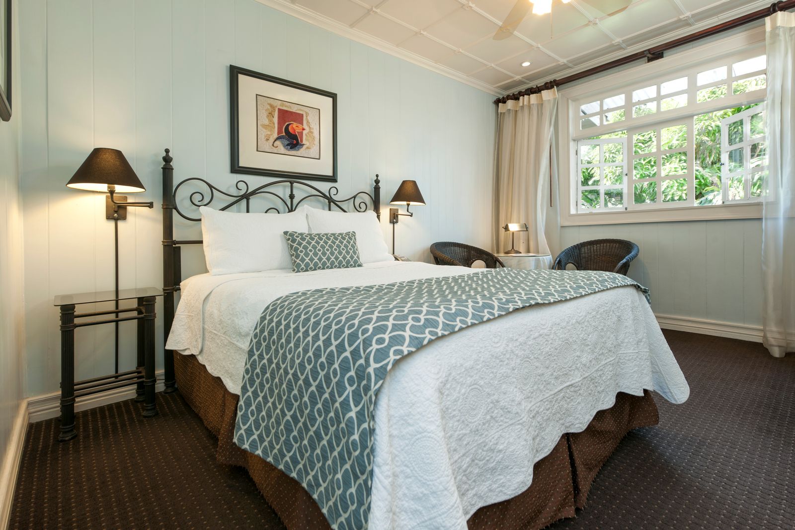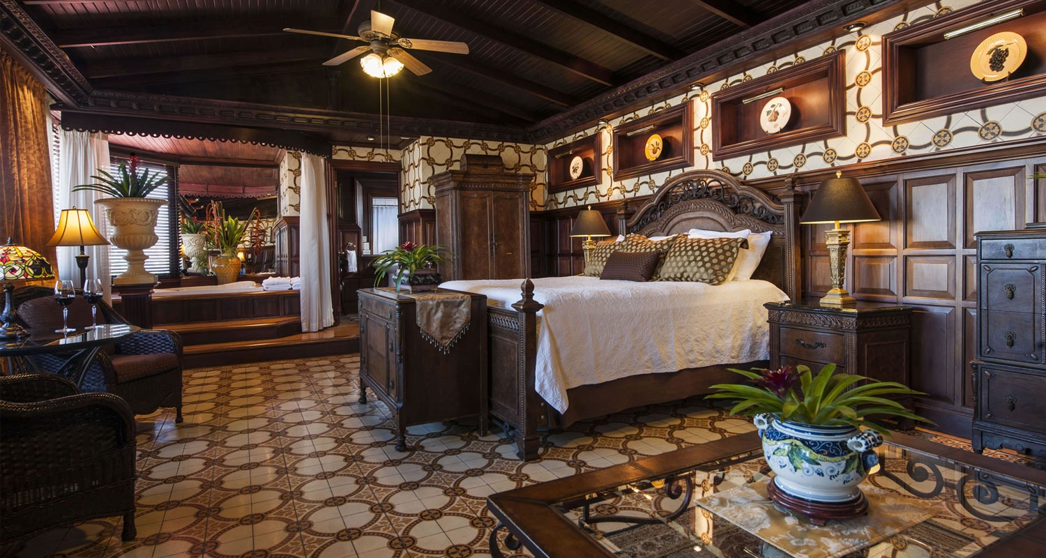 Spread across three floors, the rooms are boutique in their design, some with features from the original house and others with more modern touch. All have a wrought iron bed and wicker chairs with subtle artwork adorning the walls. Certain rooms enjoy a private garden courtyard for a break from the hustle and bustle of San Jose. The grandest of all, the Vista de Oro, is beautifully decorated with antiques and vintage pieces, and boasts a private entrance, Jacuzzi and views of the Central Valley skyline. The family suite has two bedrooms with a shared bathroom.