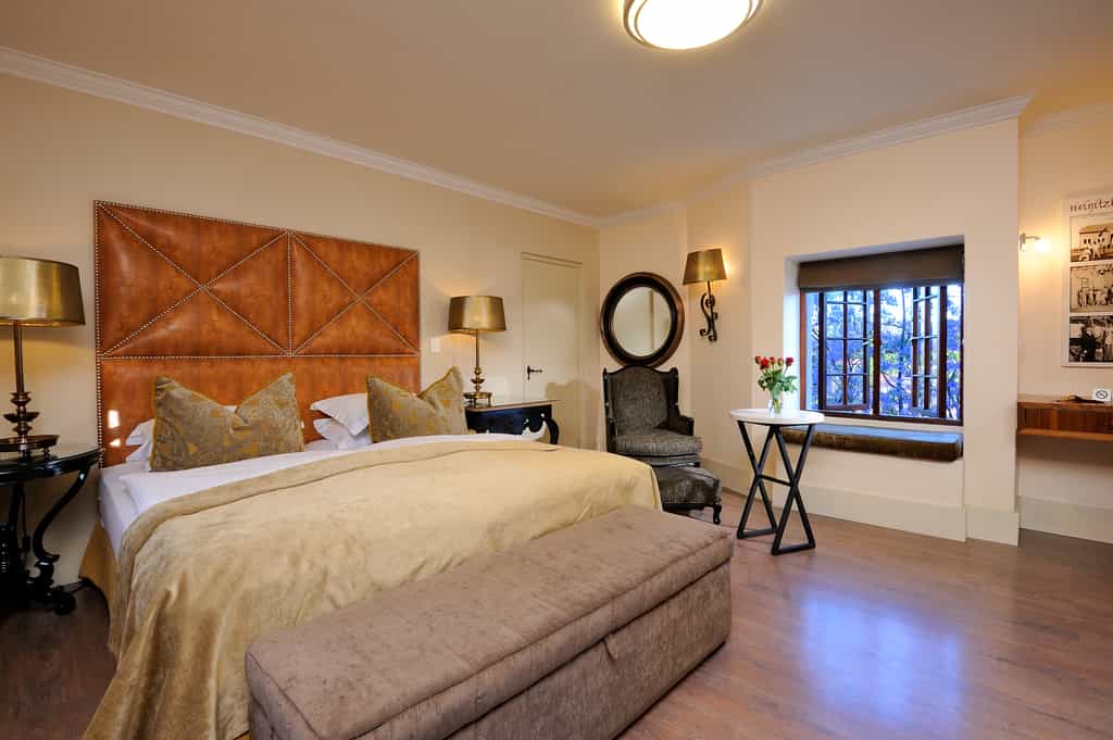 Hotel Heinitzburg's 16 en-suite rooms, including the turreted and romantic honeymoon suite, are all spacious, clean and completely different in design to its neighbour. Surrounding the rooms are the lovely gardens, where flowers bloom, birds chirp and the relaxing sound of water tinkling from fountains eases any remaining tension. Another turret overlooks a swimming pool that is guarded by an elephant which, rather unexpectedly, squirts water at intervals onto the surface. The water is heated in winter.