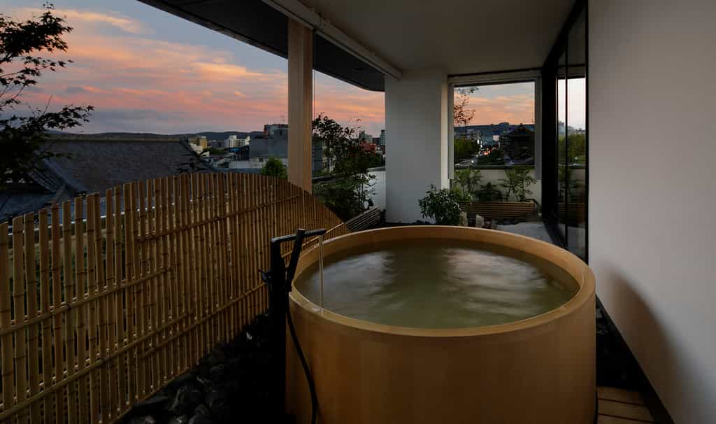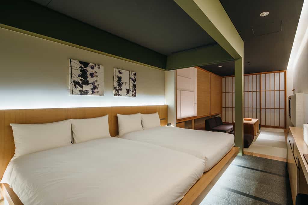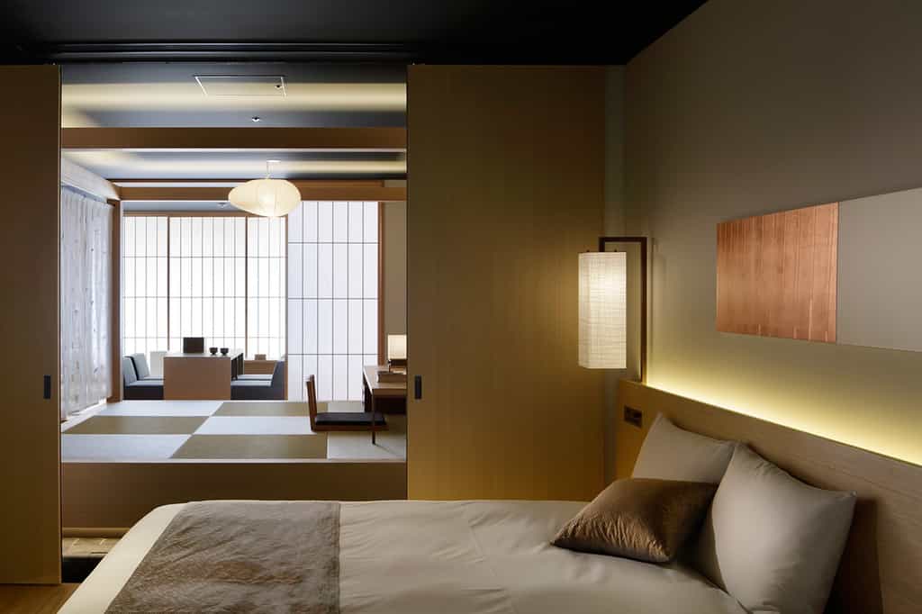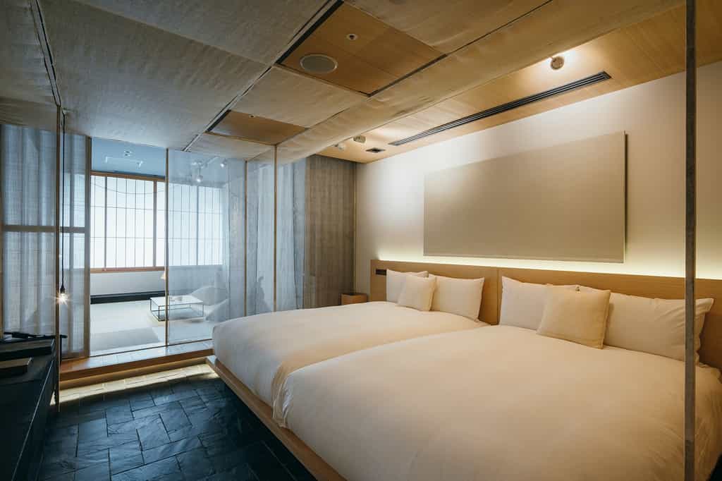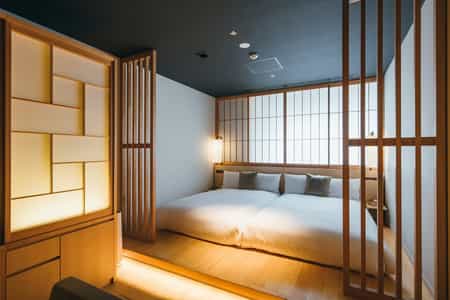 Built in the traditional Machiya style, the rooms feature neutral shades, bamboo detailing and sliding shoji windows. At their centre, each has a futon platform with a shade for added privacy, as well as a low-set seating area with a TV (this can also double as additional sleeping space). The bathrooms are sleek with mosaic tiles, a large shower and cypress tub. Floral artwork, traditional crafts from Kyoto and a silk kimono hanging in the closet add the finishing touches.