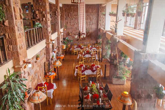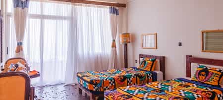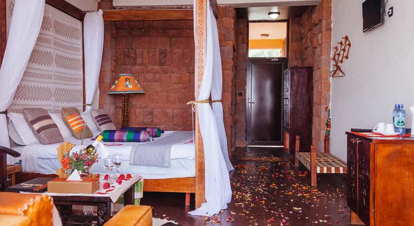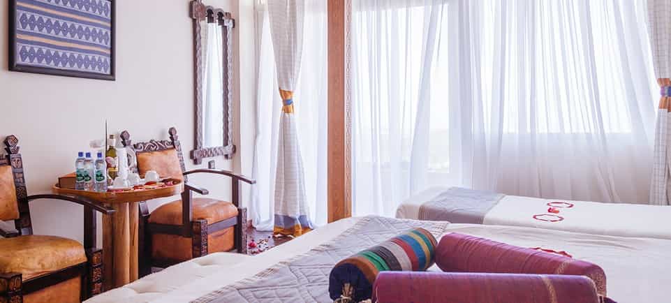 The hotel has four storeys, with the rooms spread across the top three, and the restaurant, bar and lounge on the ground floor. The main area is open-plan, but nicely partitioned into several spaces: the good restaurant flows into the lounge area with its fireplace and a few well-stocked bookshelves, then on to the grassy terrace with its sensational view. The furnishings are simple, smart and comfortable, with splashes of colour and some fine examples of Ethiopian arts and crafts.