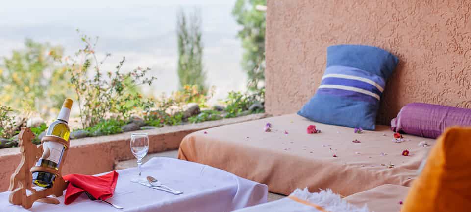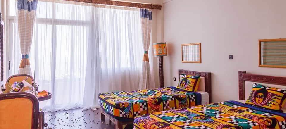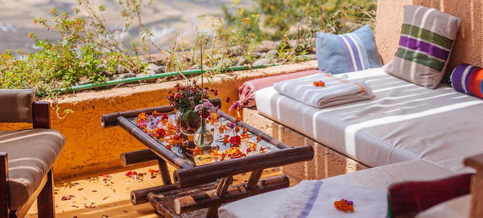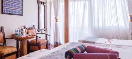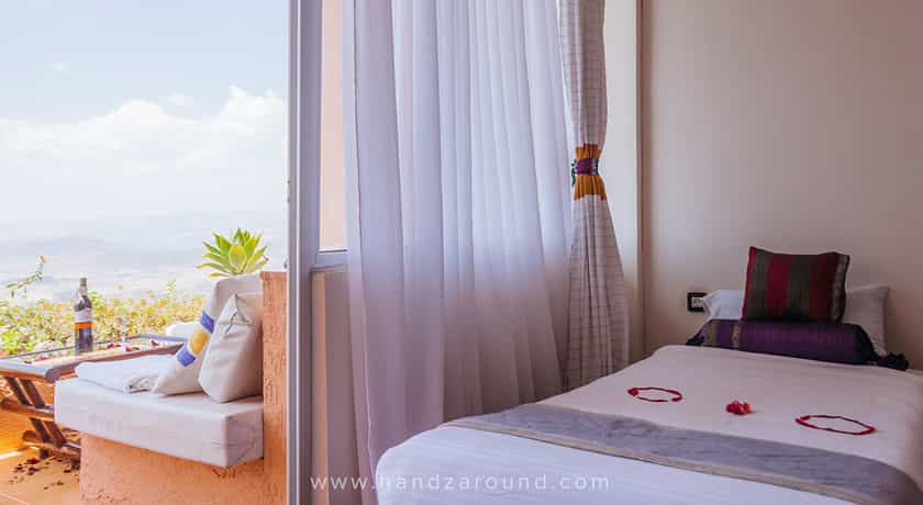 Twenty spacious rooms range across the upper levels, varying in size from single to twin-bedded and four-poster doubles. All are neat and clean, with plenty of light, colourful accessories and local art. Each room has a private balcony with a few chairs, a table and a daybed – perfect for wallowing in the valley views. You'll find tea- and coffee-making facilities, a TV, wi-fi access, and an en-suite bathroom with high-pressure hot-water shower, basin and W/C.
