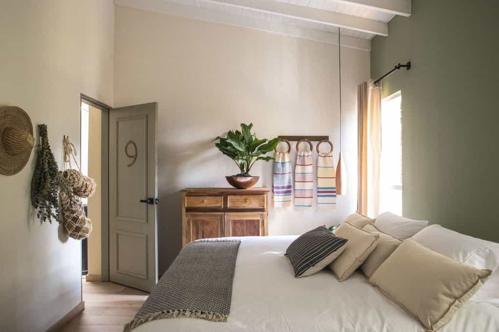 Each room is individually-designed in tones of green, peach, blue or yellow, with beautiful hand-crafted wall hangings and local furniture. Standard rooms have a Queen-size bed topped with 300 thread count sheets, while the Artisan rooms are equipped with a King and a private terrace, an idyllic spot to enjoy the sunshine and peace and quiet. The bathrooms range from modern with a large, glass-walled shower to more rustic. In keeping with their eco-conscious philosophy, there are no TVs but there is a fibre internet connection.