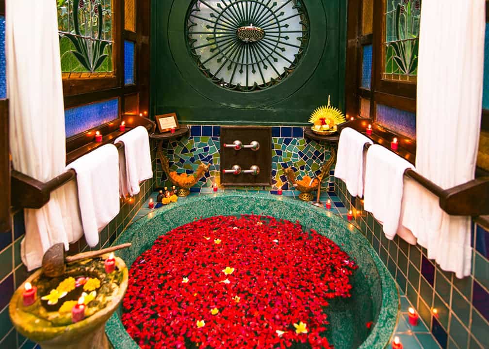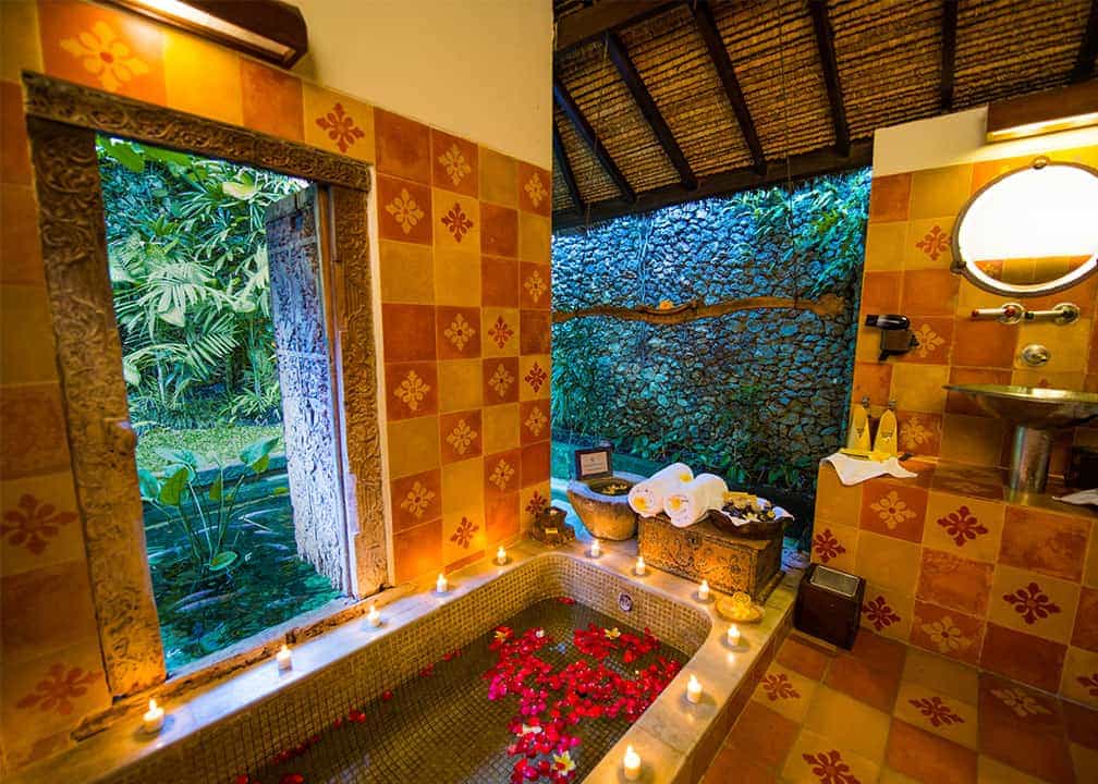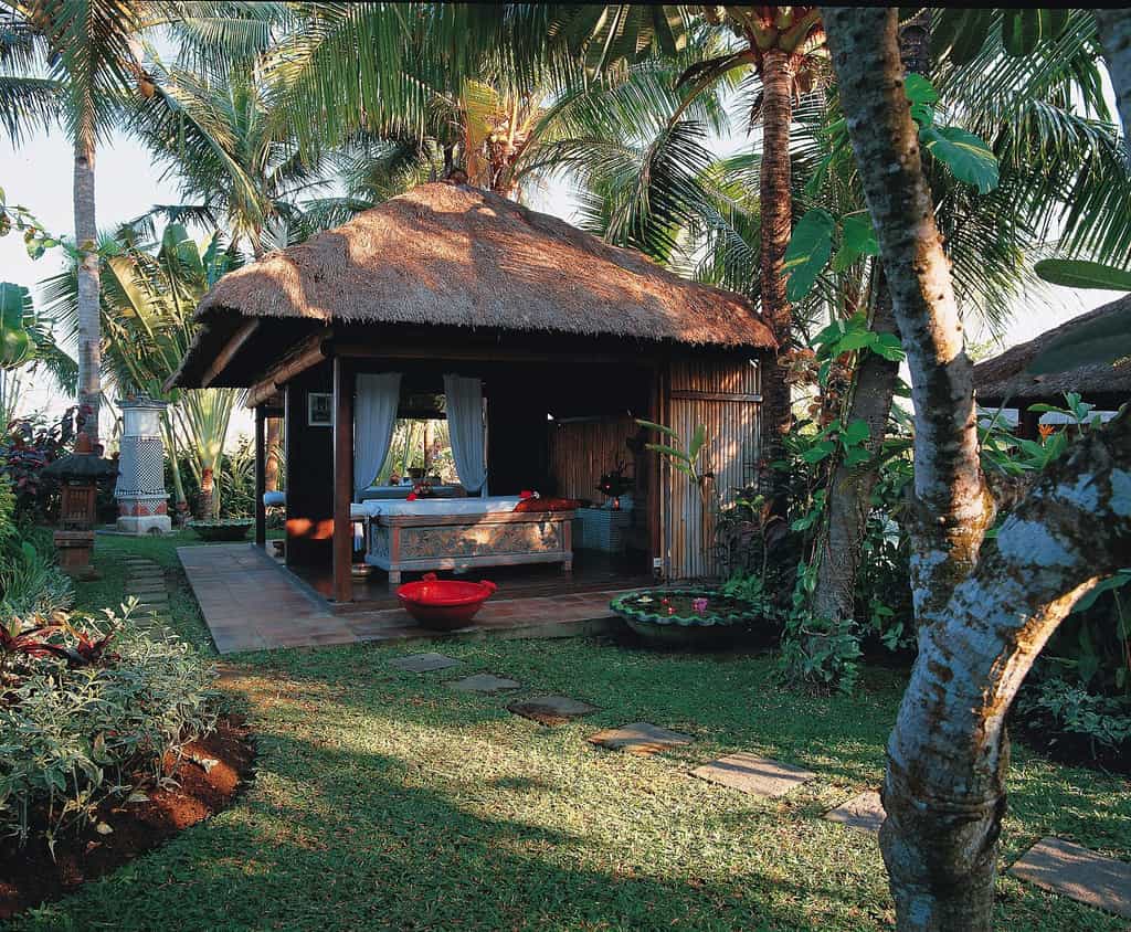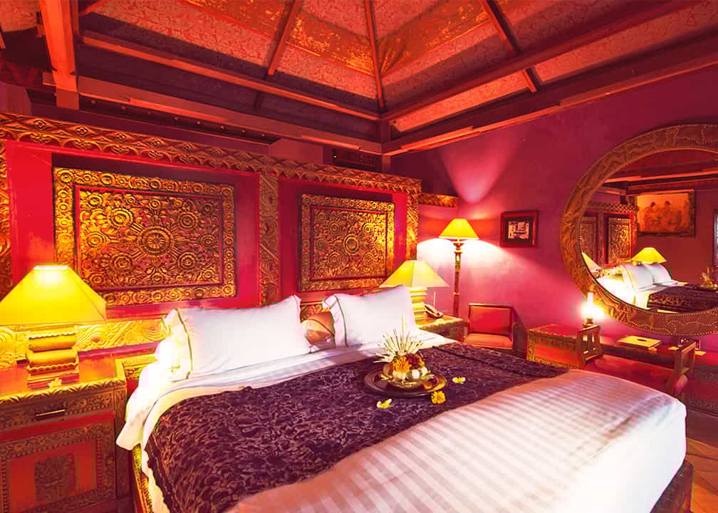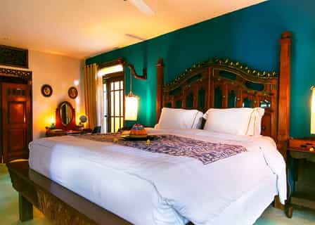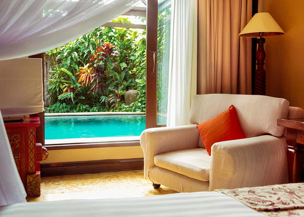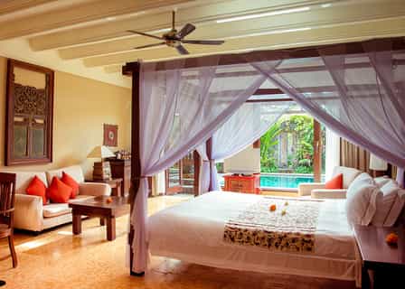The hotel has a collection of suites and villas, most of which are modelled on authentic Javanese wooden houses. They each have a unique style and inspiration, from the stained-glass windows and hand-hammered tin bath in the Rejang Suite to the Puri Le Mayeur Villa, which celebrates the love of this famous Belgian artist and his muse, dancer Ni Polok. Amenities range from room to room but all have huge canopy beds draped in flowing white curtains, while some rooms have their own plunge pool too.