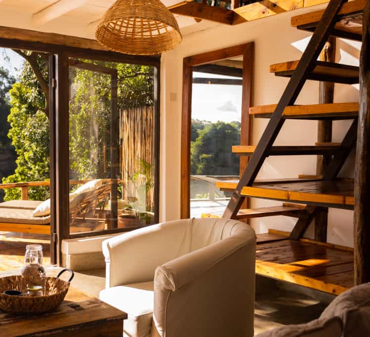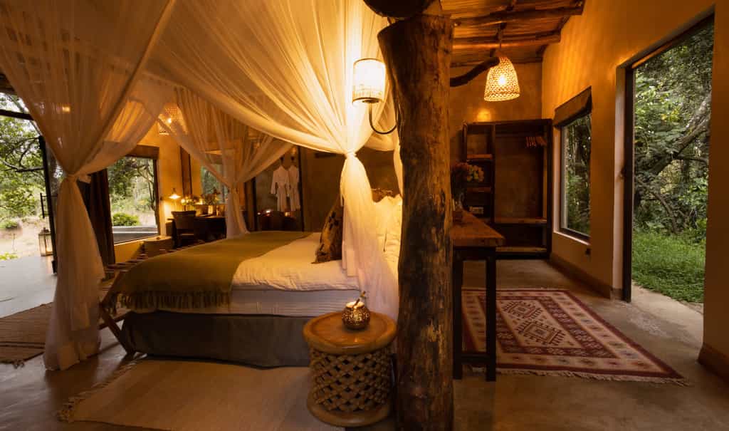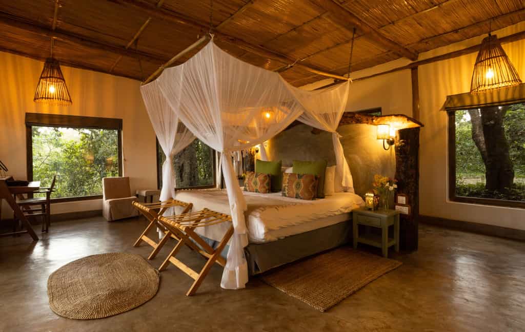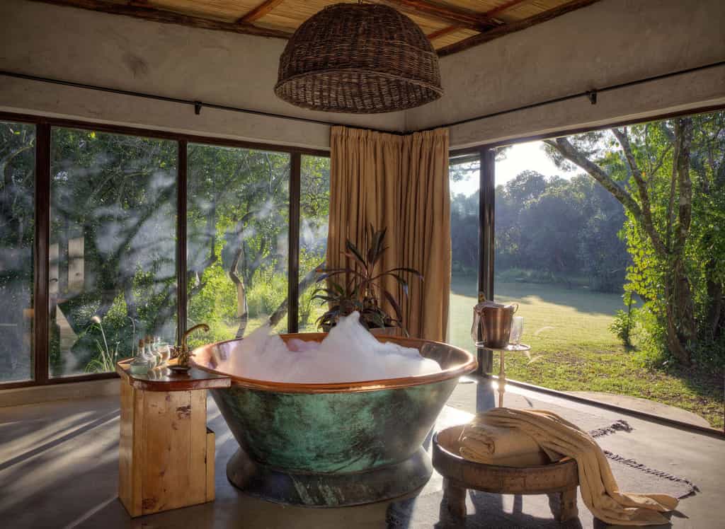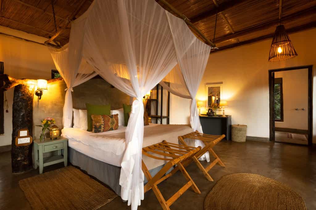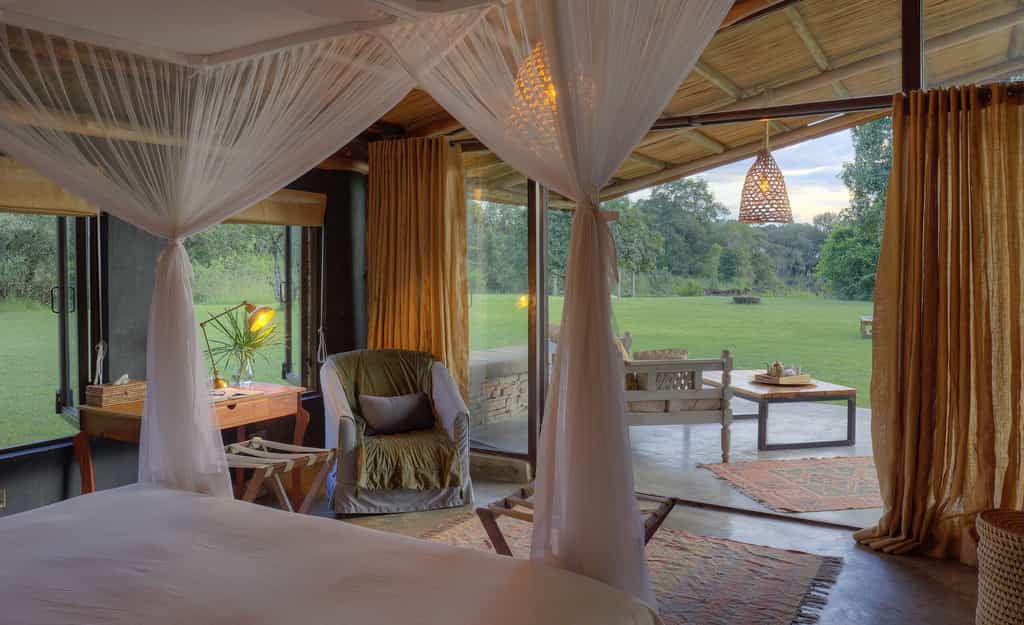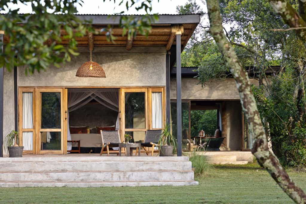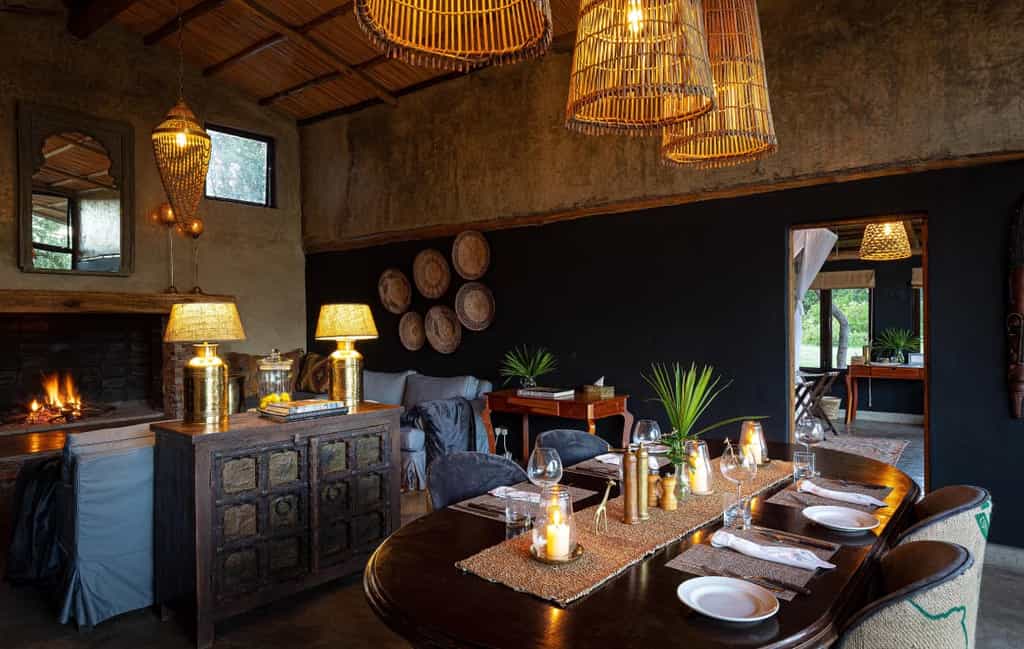 Elegant yet relaxed, natural yet homely, you'll feel right at home inside the traditional conical thatch rondavel that is the main diving and lounge area. Cosy up on the plush sofas and light the fire on chilly evenings, or pull a chair out to the garden and watch the river go by. Outside, the pretty lawn stretches all the way to the river and there's also a swimming pool with outside shaded seating area for meals al fresco.