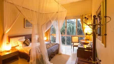 Just 18 rooms span the resort's ground or upper level, all featuring high ceilings, tiled floors and large sliding-glass windows facing the interior courtyard. The decor is simple but charming, and the rooms are, importantly, crisp and clean. Beds are configured as a large doubles or two twins, all draped with mosquito netting. En-suite bathrooms have high pressure showers. Other mod cons include bluetooth speakers, a minibar, air-conditioning and a tea/coffee station.
