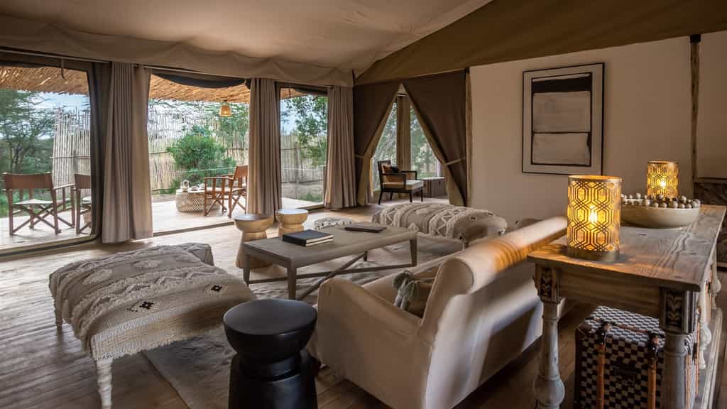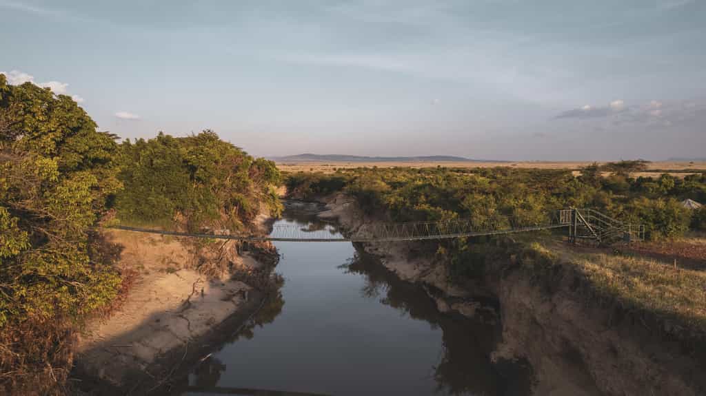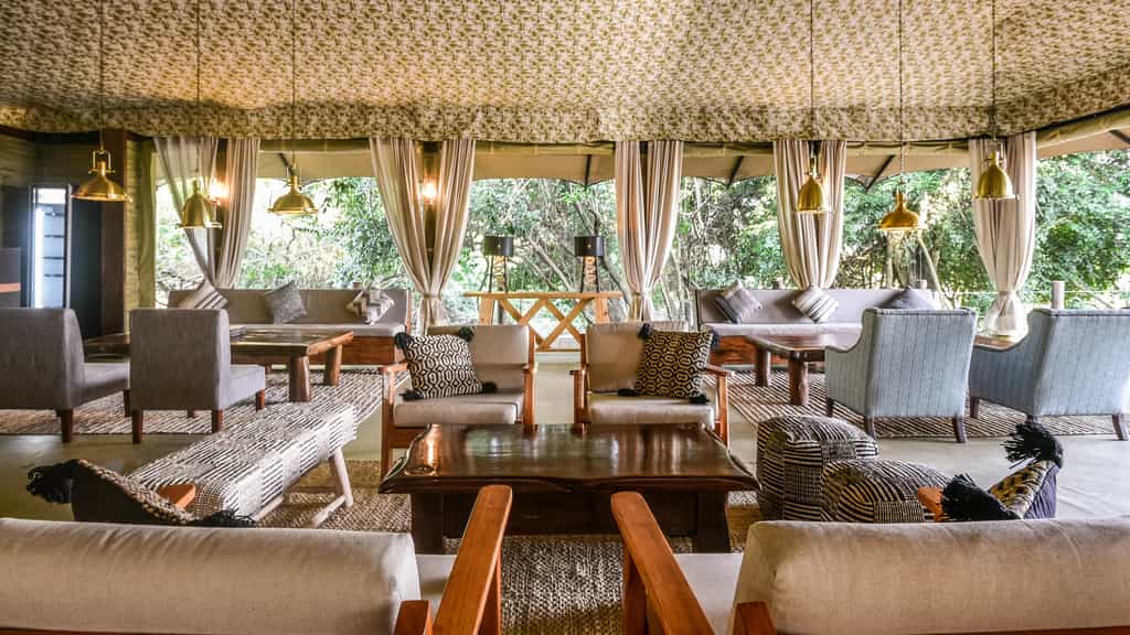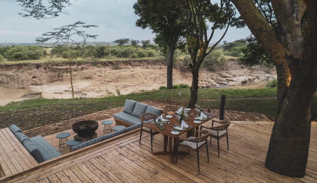 Twelve tents are strung out on wooden decks along the river, promising striking views into the Masai Mara and the utmost privacy. They tents are spacious and immaculately designed with plenty of foldaway flaps for excellent airflow. Out front is a furnished deck with sun loungers for between-activity game viewing or siesta-ing. Inside, a double bed is made up with quality linens and surrounded by mosquito netting. Running the length of the tent, you'll find an en-suite bathroom, which consists of a flush toilet and solar-heated shower.