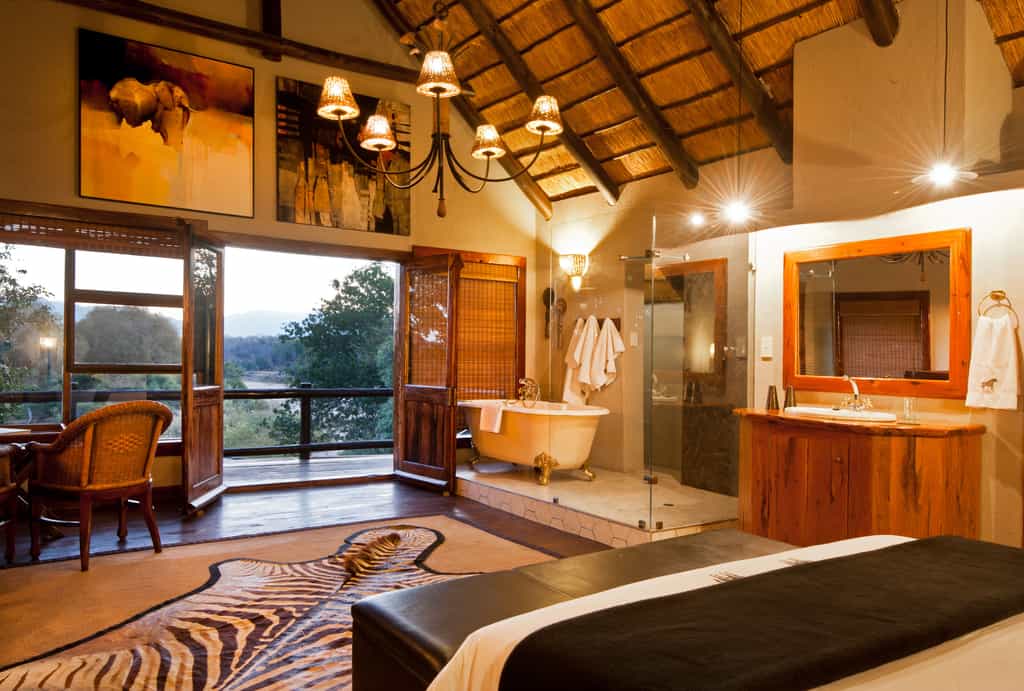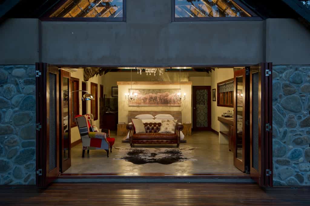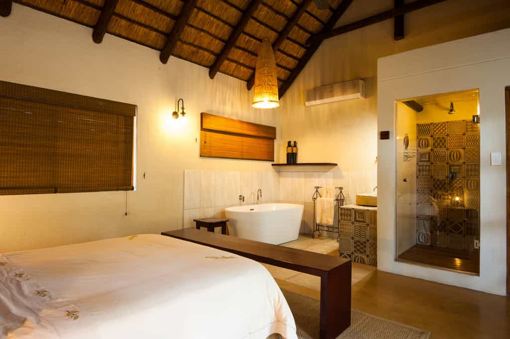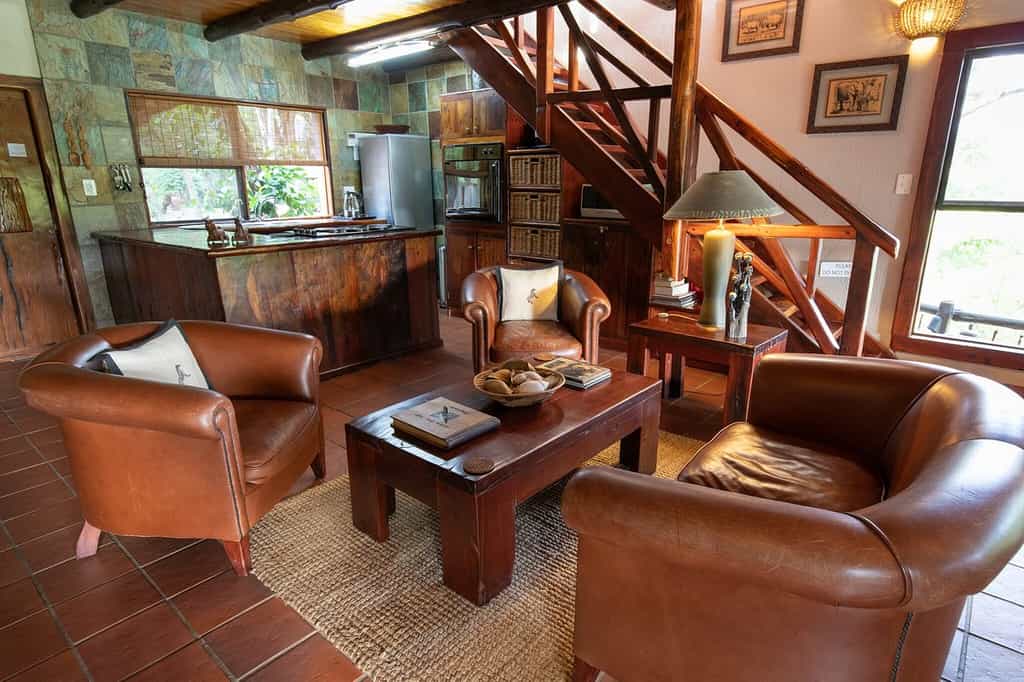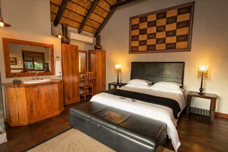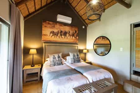 Indlovu River Lodge provides accommodation in spacious villas and suites on the river banks. The villas are hidden under towering trees, with a portion of the Drakensberg mountains providing a magnificent backdrop. They are built in true African style with beautiful stone-clad walls and thatched roofs, and have their own kitchens, swimming pools and bomas ensuring exclusivity and privacy. The suites have rooms and en-suite bathrooms. There is a superior honeymoon suite with a king-size bed and an open plan bathroom.