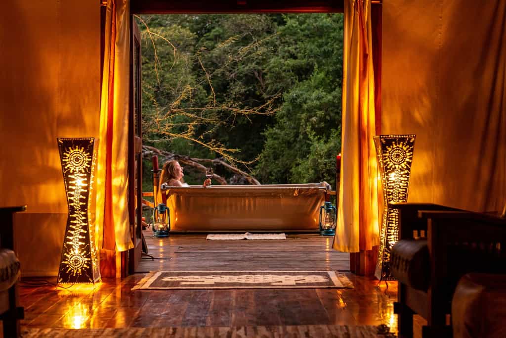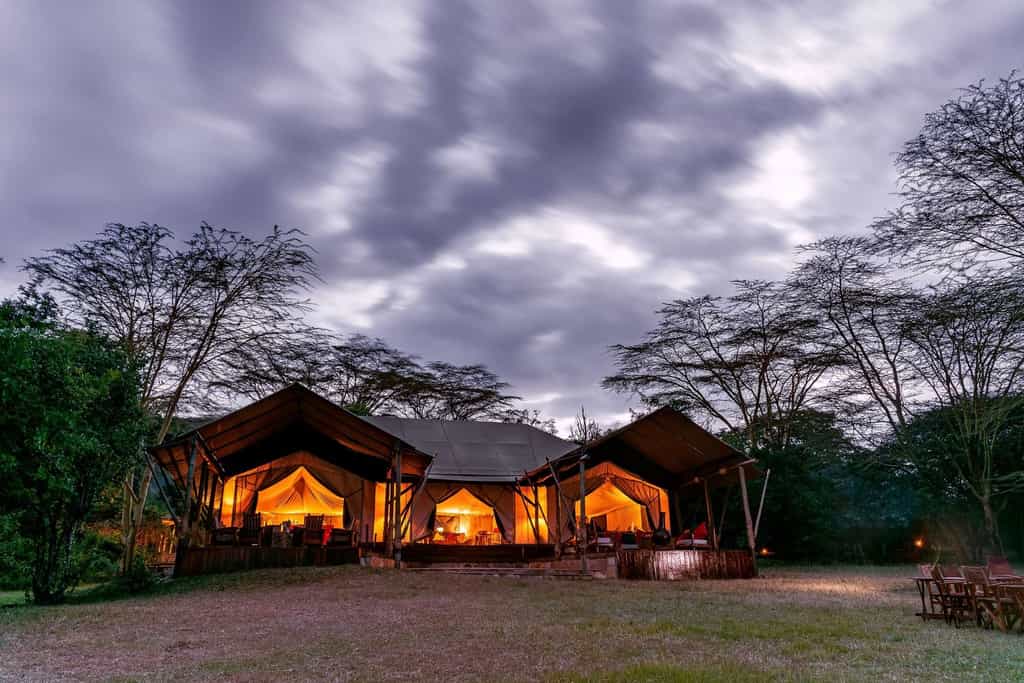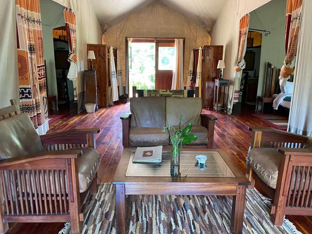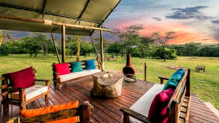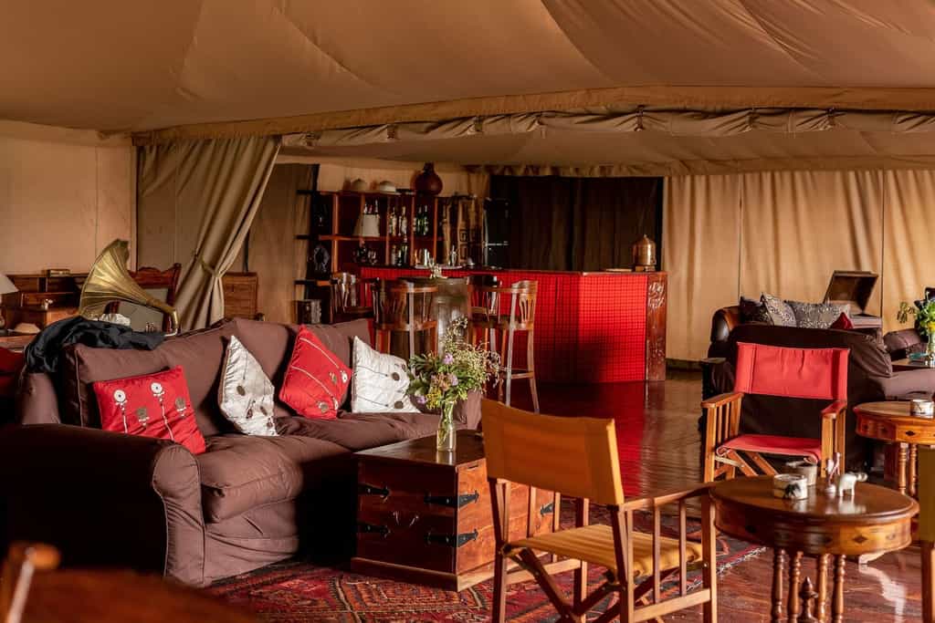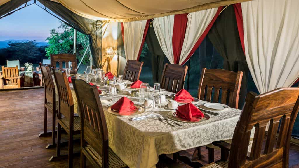 Most meals are enjoyed on the open grassland just outside the main area. With views out towards the salt lick, they often feature a zebra or wildebeest roaming the area. The mess tent is comprised of a more formal dining area and a large decked area perfect for catching up on the day’s sightings and adventures.